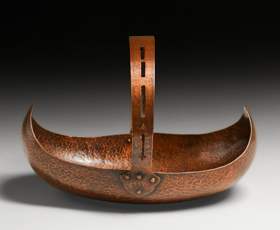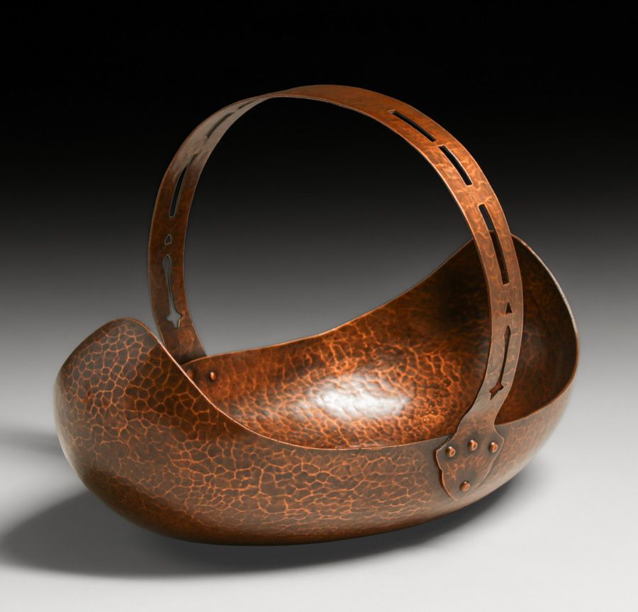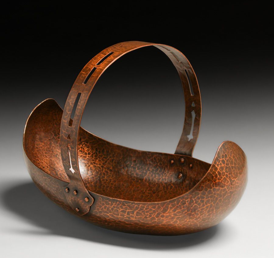 - Dirk van Erp Hammered Copper Cutout One-Handled Flower Basket c1915-1920