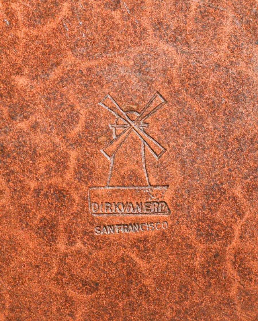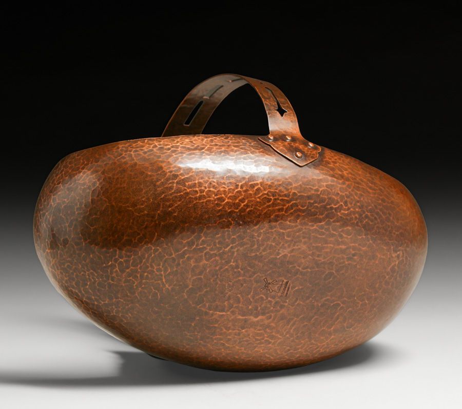 Dirk van Erp Hammered Copper Cutout One-Handled Flower Basket c1915-1920. Signed with open-box, San Francisco mark. Excellent new patina. 8″h x 10.75″w x 7.25″