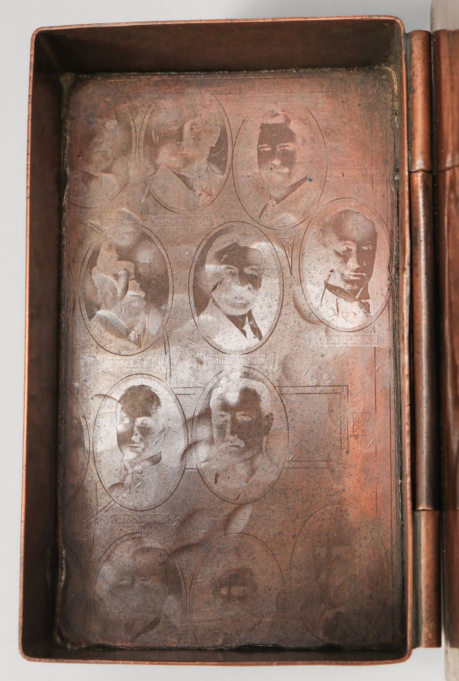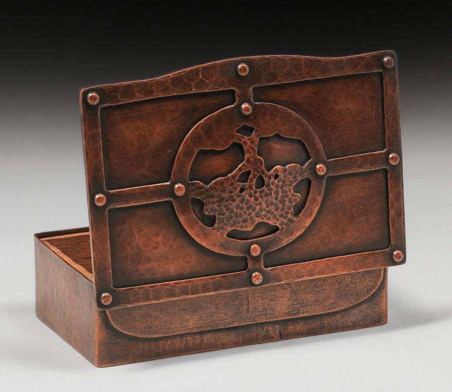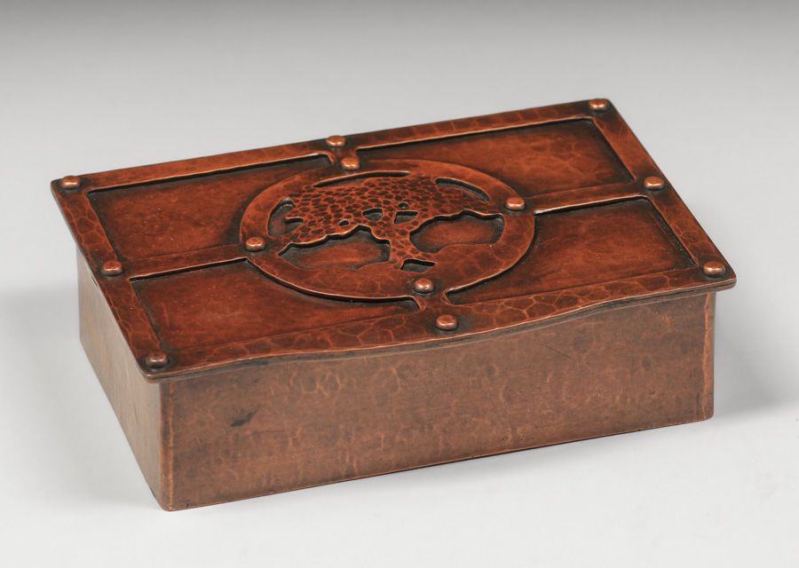 - Dirk van Erp Hammered Copper Cutout & Riveted Oak Tree Box c1913-1914