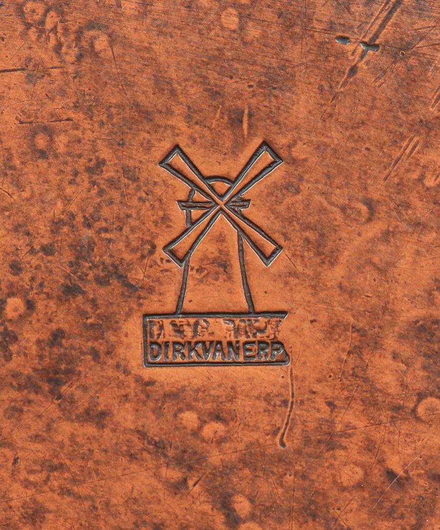 Dirk van Erp Hammered Copper Cutout & Riveted Oak Tree Box c1913-1914. The oak tree motif was originally designed by Thomas McGlynn. Signed. Excellent new patina. 5 7/8"w x 4"d x 1.75"h SOLD