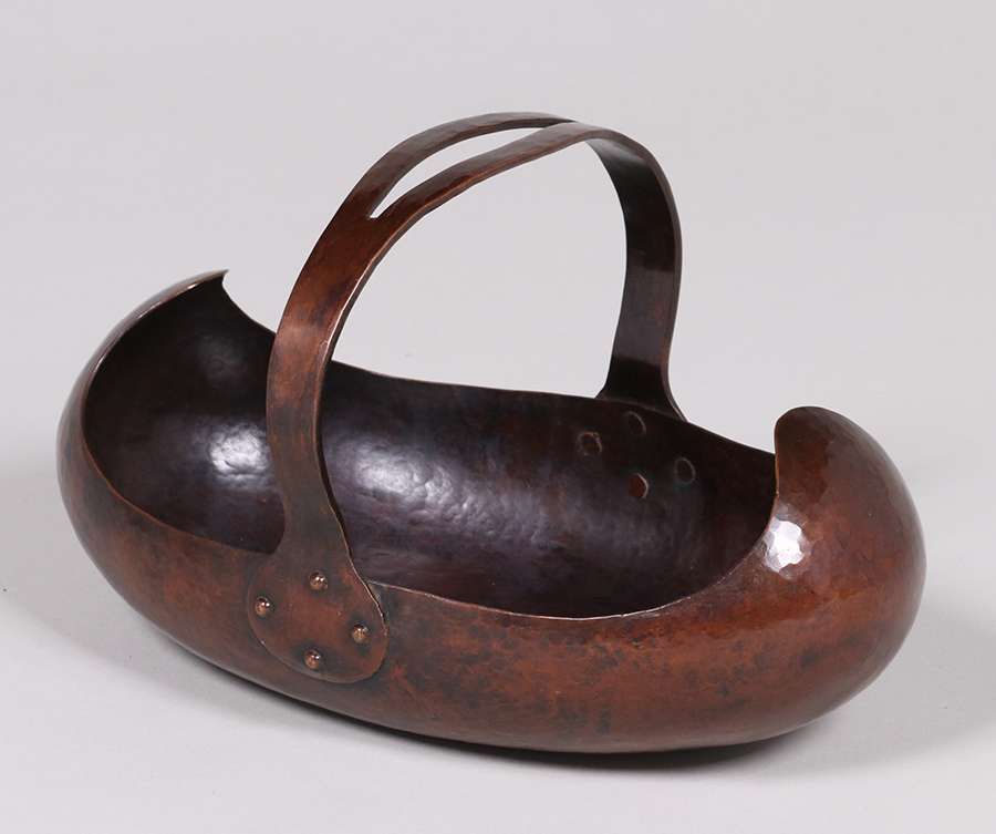 Dirk van Erp hammered copper Dutch-Shoe shaped one-handled flower basket with unusual cutout handle c1913-1914. Signed with open-box, San Francisco mark. Excellent original patina. 6.25"h x 11"w x 6.5"d SOLD