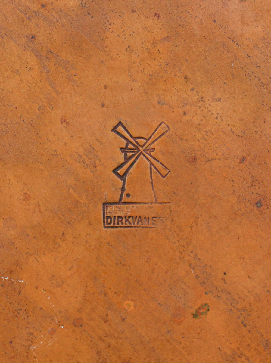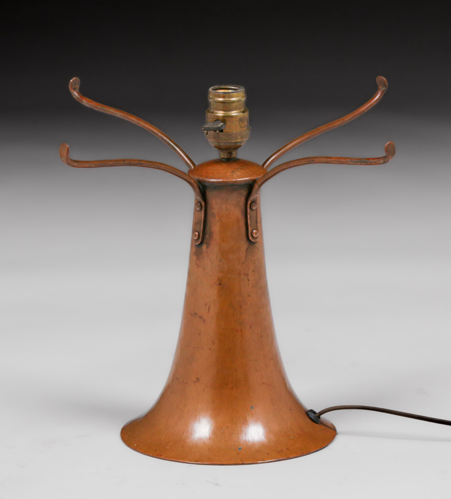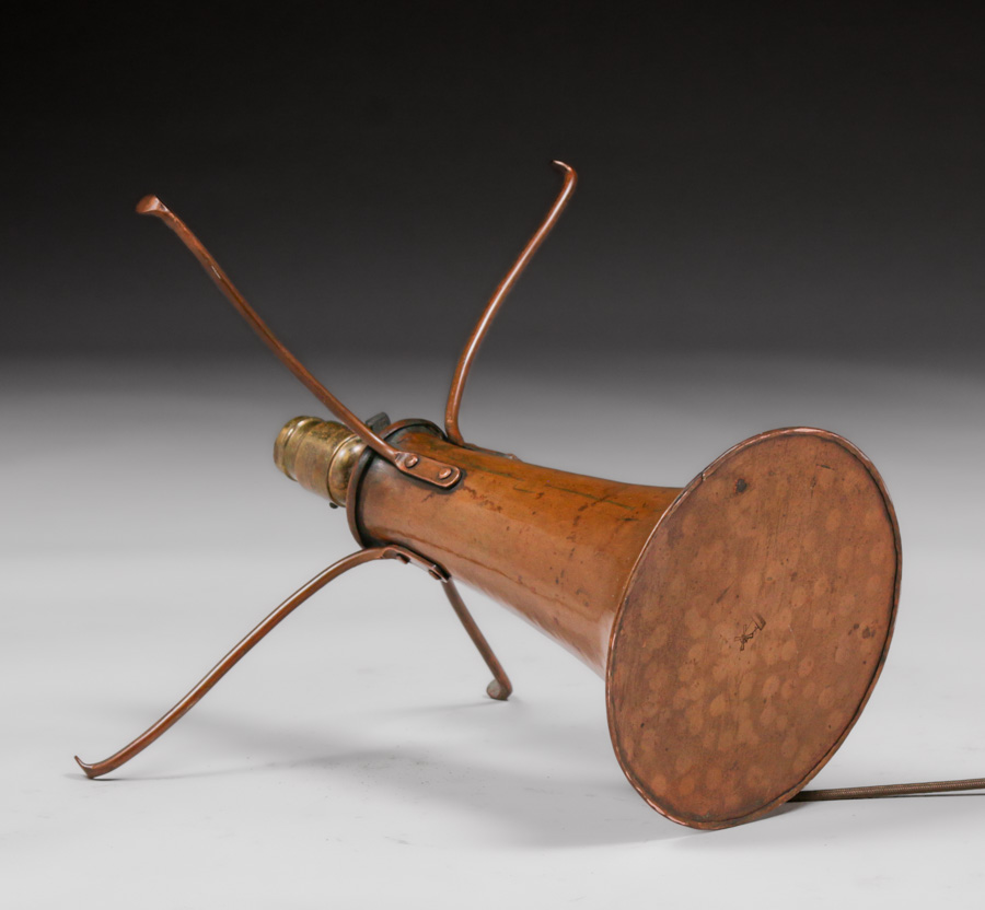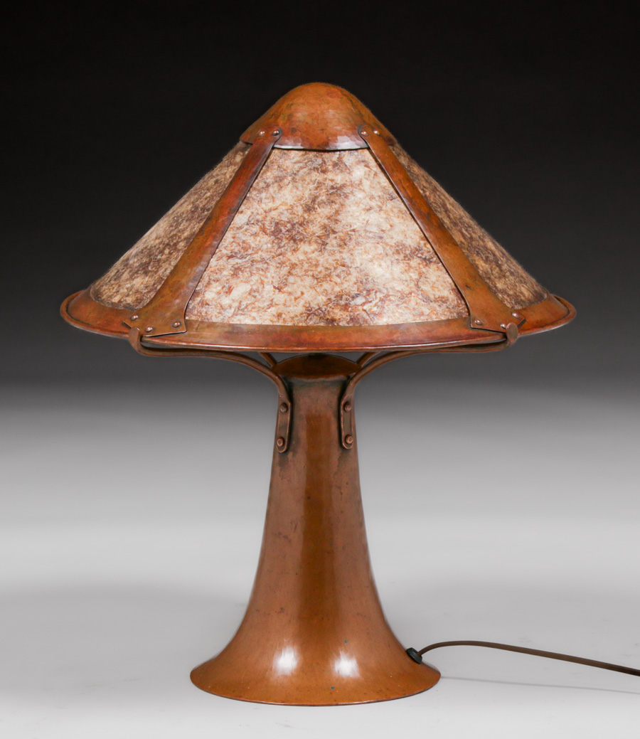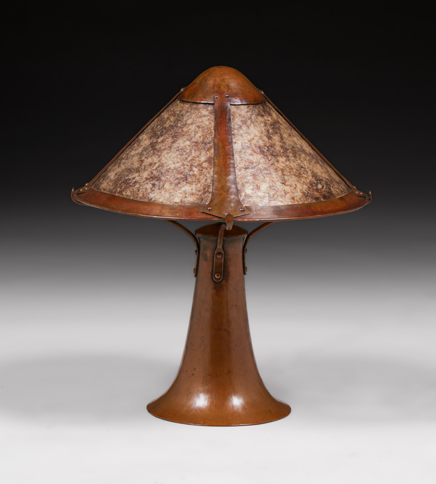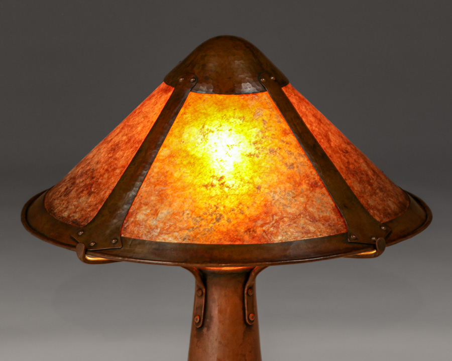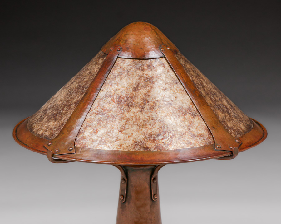 21765. Dirk van Erp Hammered Copper & Mica Lamp c1913-1914. Signed with open-box mark. Excellent original patina and 40 year old replaced mica. 18.5″h x 15.5″d $22,000