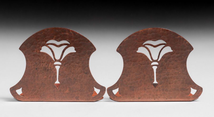 - Dirk van Erp Hammered Copper Poppy Cutout Bookends c1913-1914