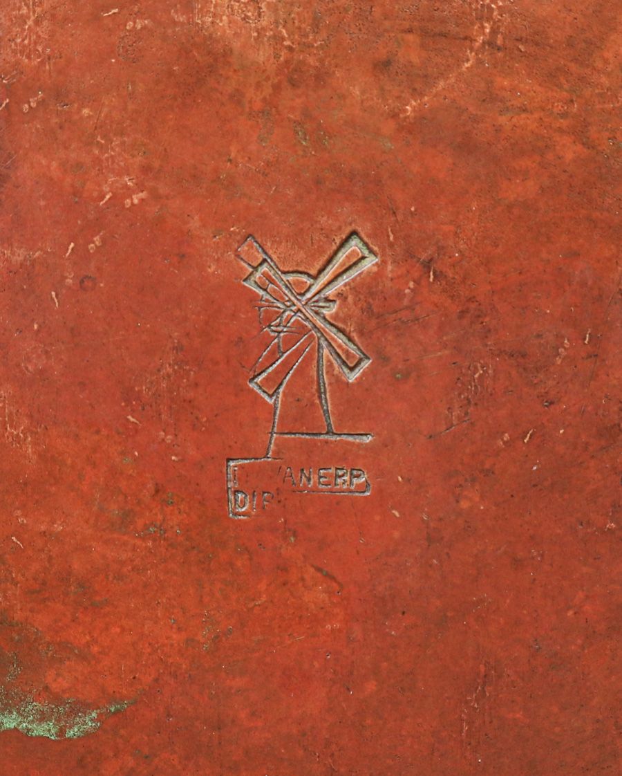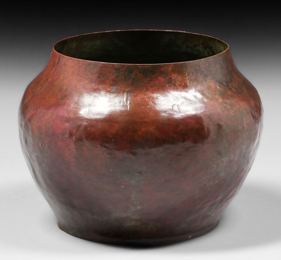 Dirk van Erp Hammered Copper Red Warty Vase c1913-1914. Signed with open-box mark. Excellent original red warty patina. 7.75″d x 5.75″h $7500