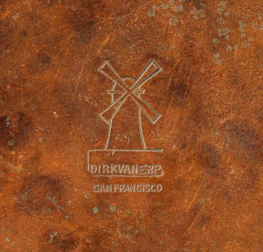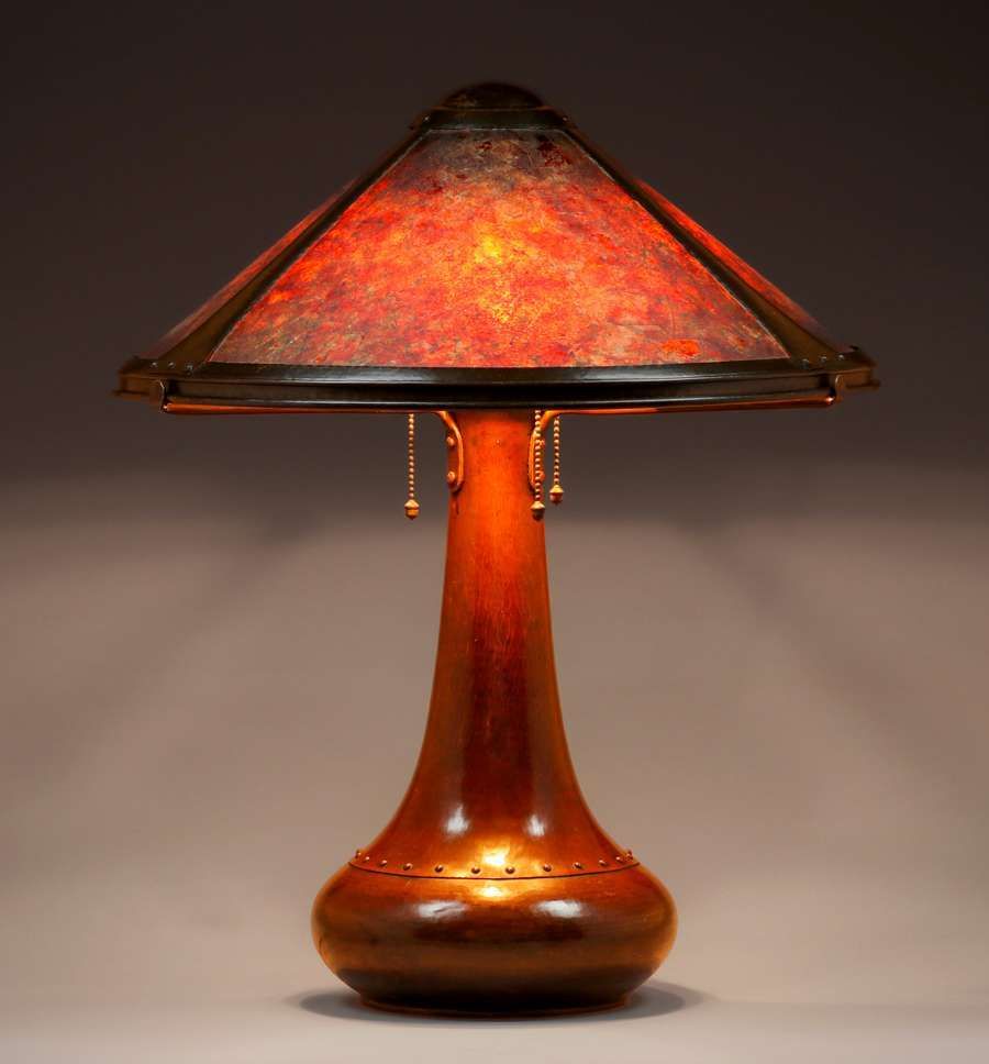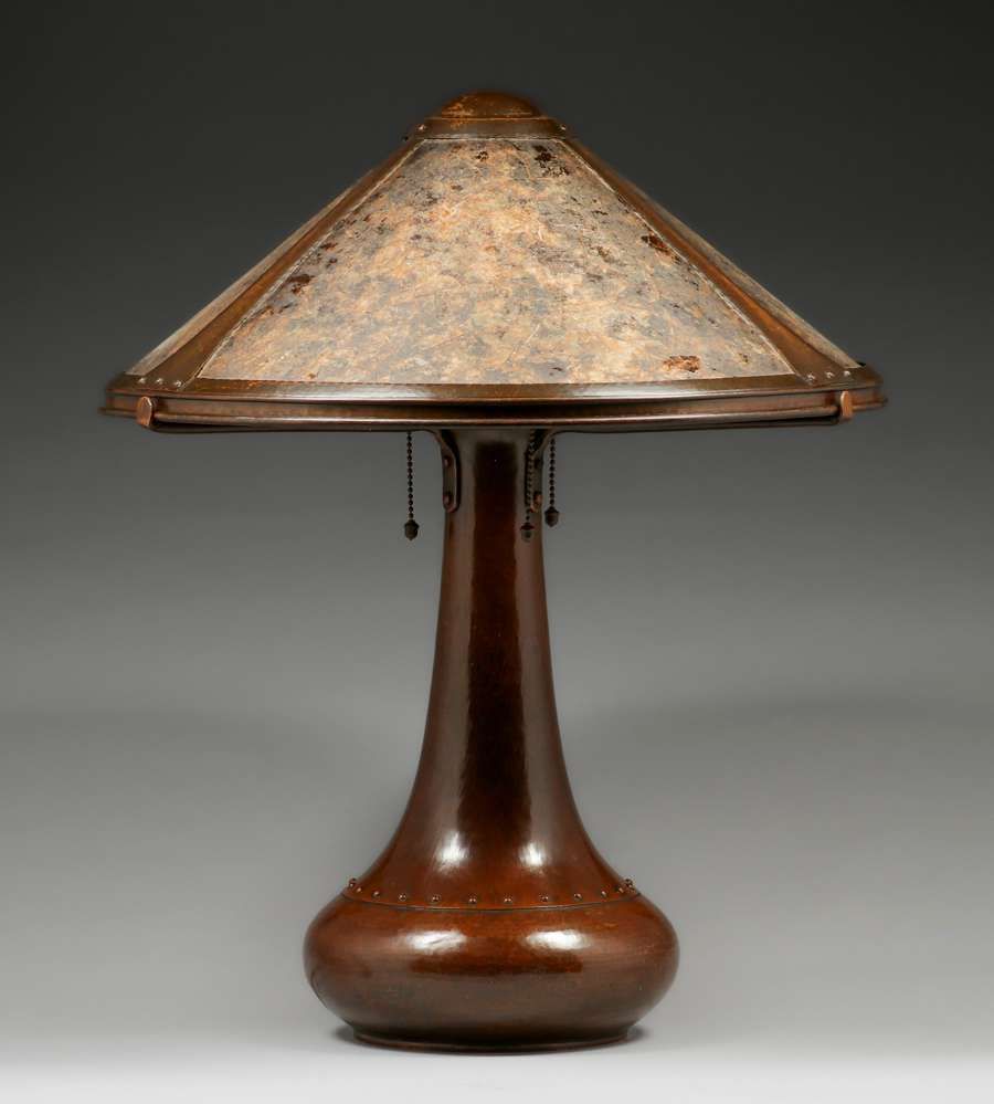 Dirk van Erp Hammered Copper Rivetbase Three-Socket Lamp c1915-1920. Signed with open-box, San Francisco mark. Excellent original patina and original mica. 23"h x 19"d SOLD