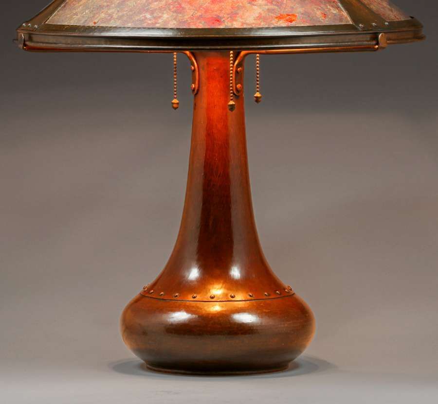 - Dirk van Erp Hammered Copper Rivetbase Three-Socket Lamp c1915-1920
