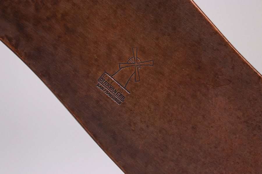 Dirk van Erp hammered copper "S" shaped sculpture. Excellent new patina. Signed with open-box, San Francisco mark. 13.5" x 7" x 2.25" thick SOLD