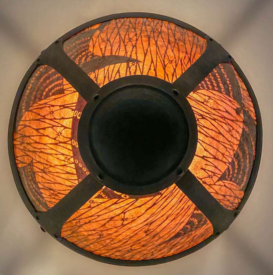 Dirk van Erp Hammered Copper & Stenciled Mica Boudoir Lamp c1920s. Excellent original patina and original stenciled mica. This is one of the best examples of stenciled mica that we have seen and mostly likely done by Agatha van Erp. Open-box, San Francisco mark. 11.5″h x 11″d SOLD