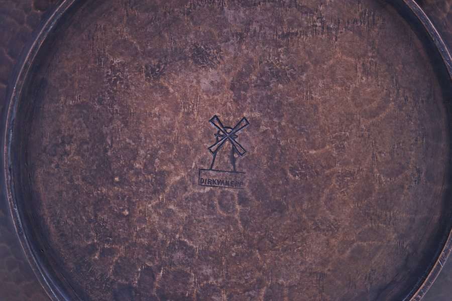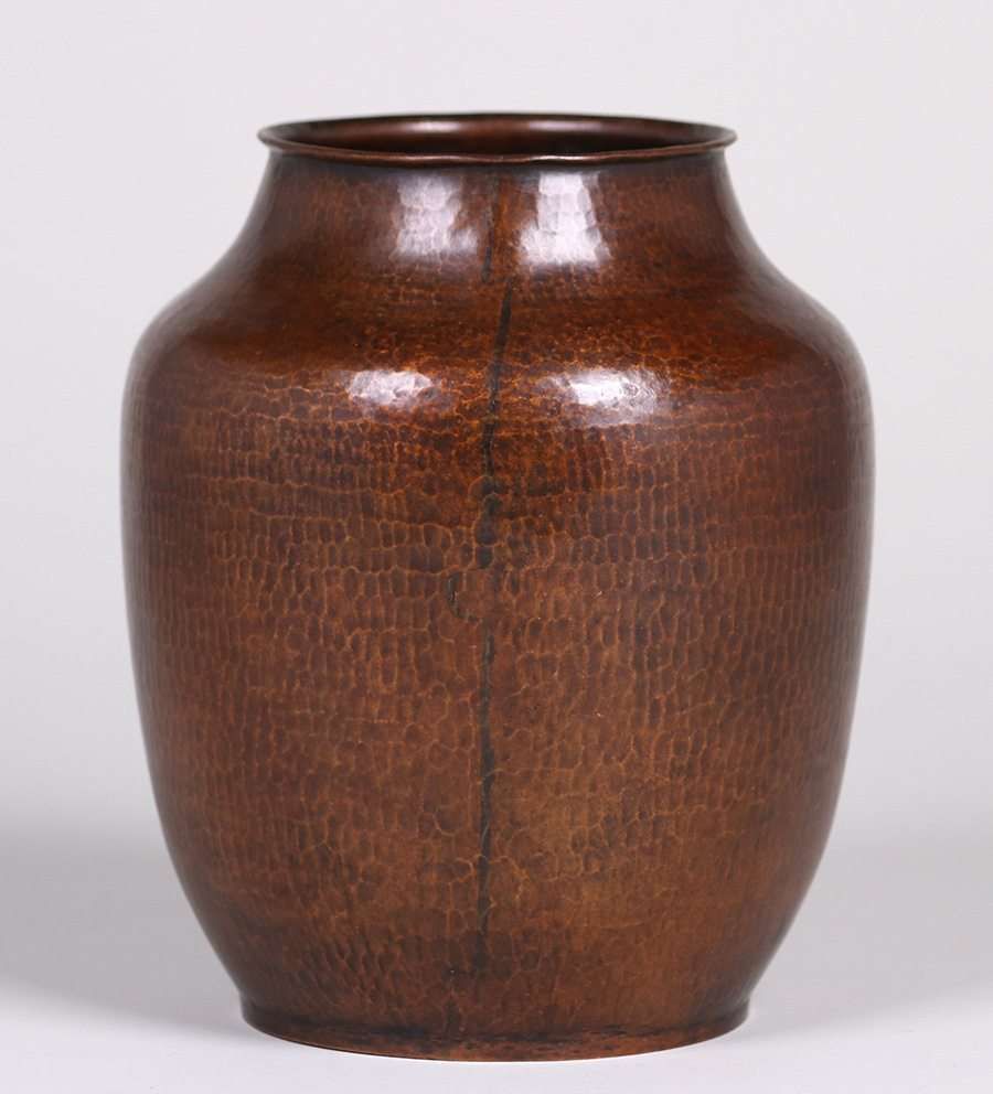 Dirk van Erp hammered copper vase with soft shoulder and slightly flared, rolled rim c1913-1914. Signed with open-box mark. Excellent new patina. 8 1/8"h x 6.5"d SOLD