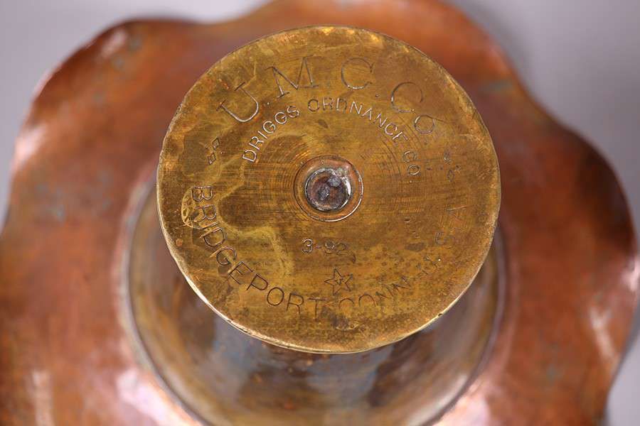 Dirk van Erp Short Shell Casing Vase signed "UMC Co 3-92". 2 7/8"h x 4.75"d SOLD Early Unsigned Dirk van Er p Hammered Copper Vase 9.75"h. Excellent original patina SOLD