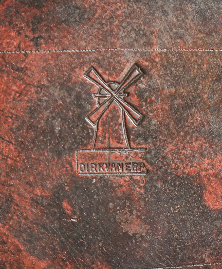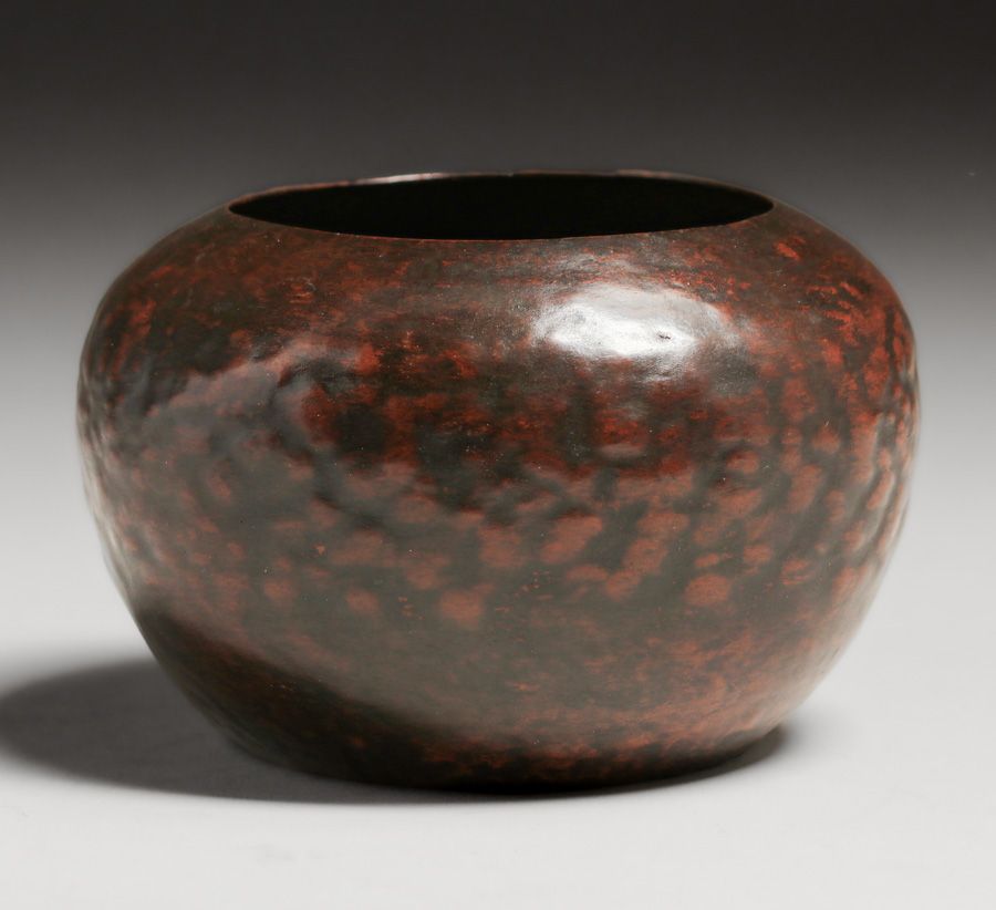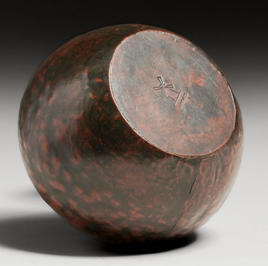 Dirk van Erp Hammered Copper Warty Vase c1913-1914. Exquisite example of van Erp’s warty with a rich dark reddish brown original patina. Signed with open-box mark. Excellent original patina. 4.75″d x 3 1/8″h SOLD