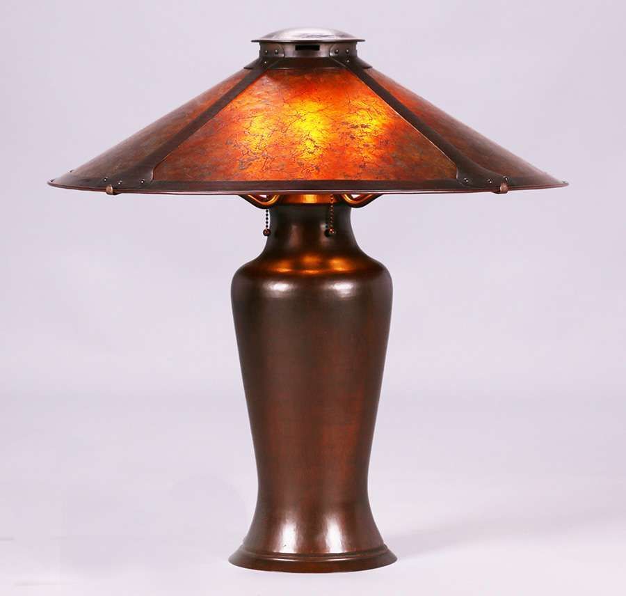 Dirk van Erp Milkcan-shaped hammered copper lamp base c1920s with a contemporary Luke Marshall hammered copper & mica shade. Base has its original finish. Signed with open-box, San Francisco mark. 25"h x 24"d SOLD