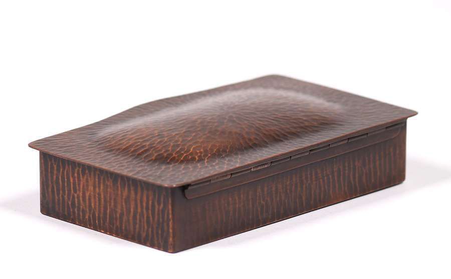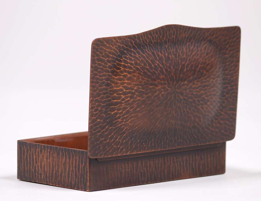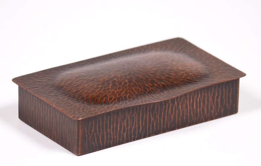 Dirk van Erp hammered copper box with beautiful radial hammering c1915-1920. Signed with open-box, San Francisco mark. Excellent new patina. 6.5"w x 4"d x 1.5"h SOLD