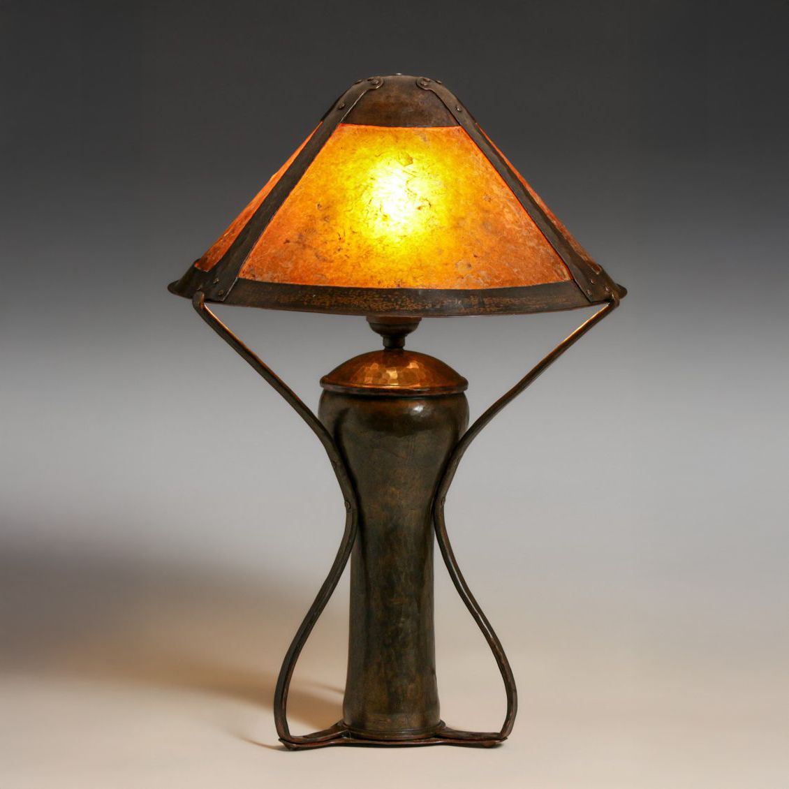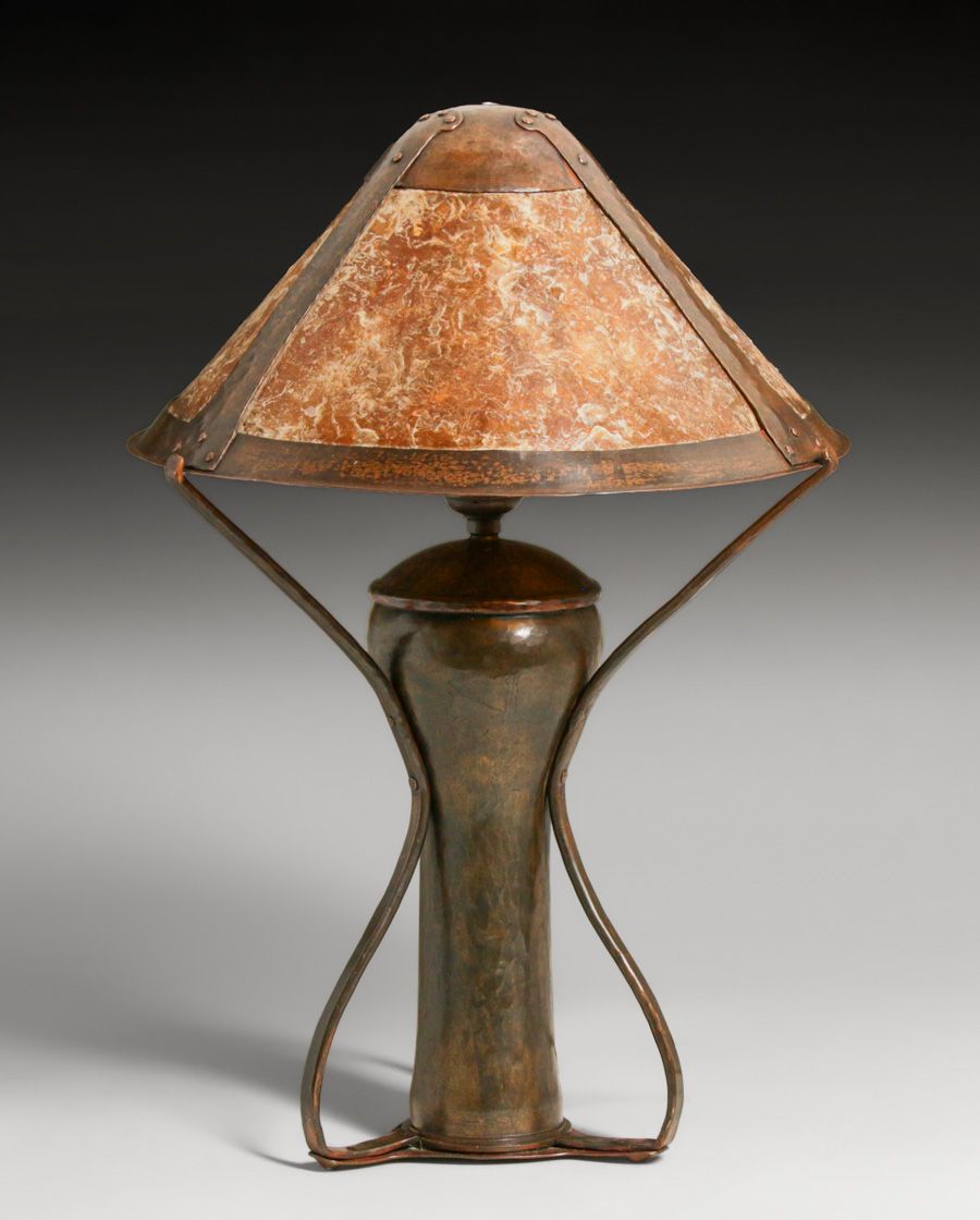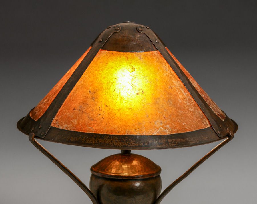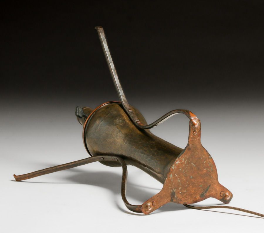 - Early Dirk van Erp Hammered Copper, Brass & Mica Shell Casing Lamp c1906