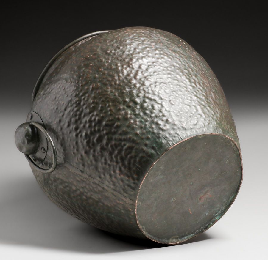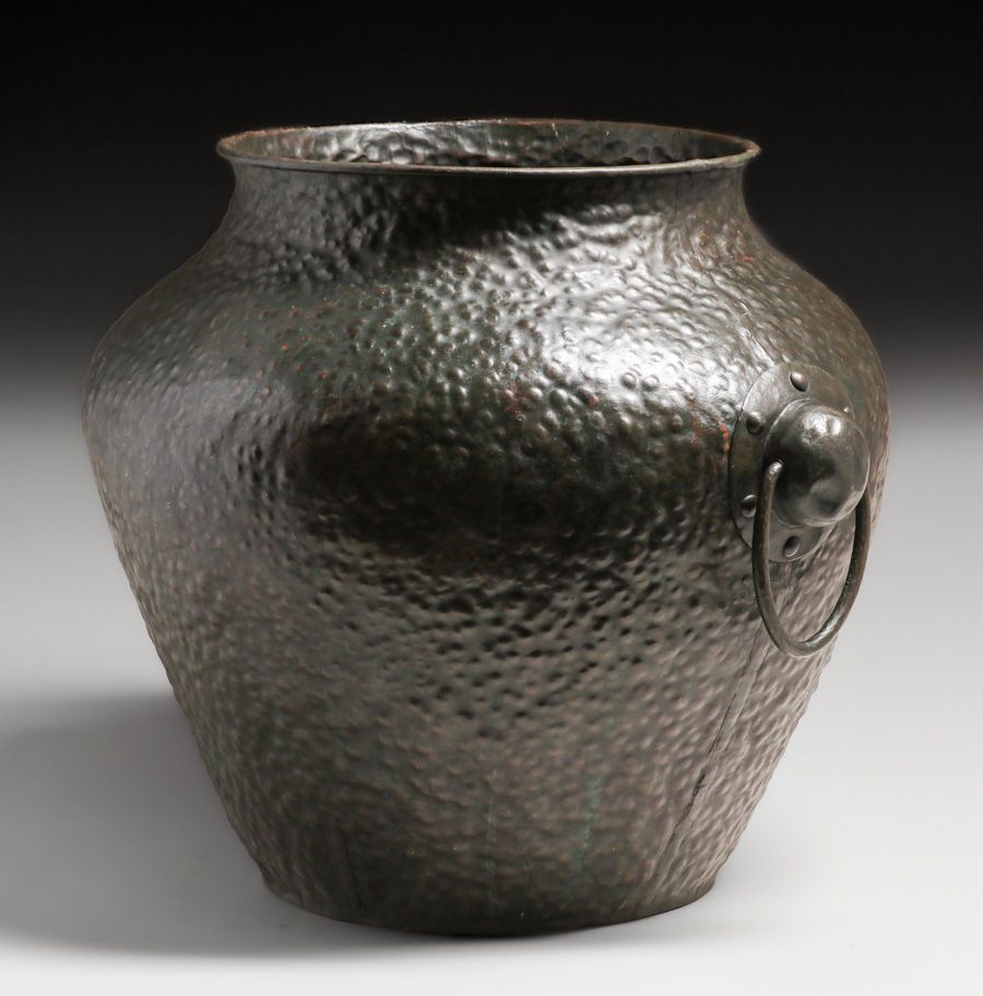 Early Dirk van Erp Hammered Copper Warty Two-Handled Vase c1908-1909. Likely made by Harry Dixon while working for Dirk van Erp in the Oakland Shop. Unsigned. Excellent original patina. 18.5"d x 15.5"h $38,000