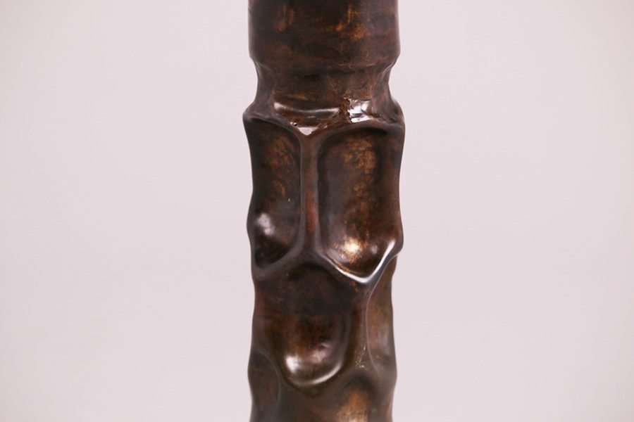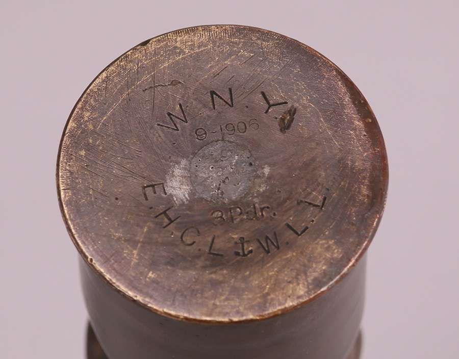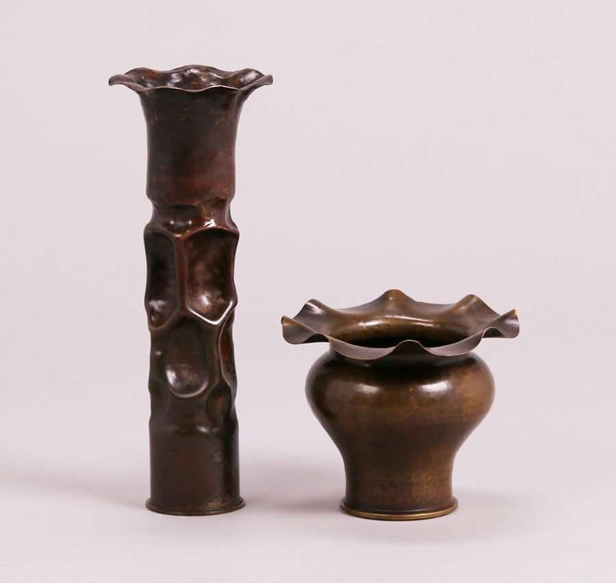 Unusual early Dirk van Erp hammered brass shell casing vase with "curtained" warty design. This type of warty design has been seen on extremely rare copper vases, but never in his earlier shell casings. Marked "WNY" and "9-1906". 11"h x 4"d SOLD