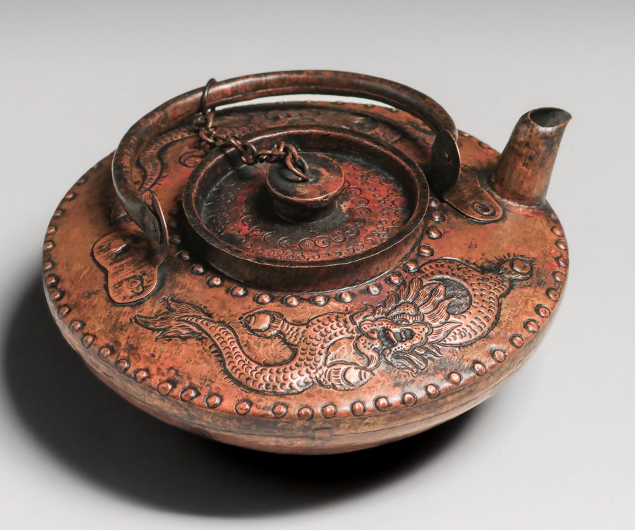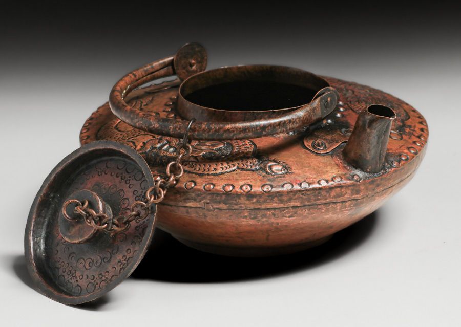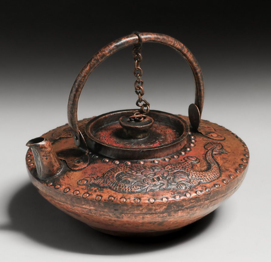 Early Dirk van Erp - Vallejo, CA Aesthetic Movement Hammered Copper Teapot c1900s. Unsigned. Excellent original patina. This is van Erp's interpretation of a Chinese Teapot. Extraordinary repousse and chase work, spotted bottom, crimped and riveted seam construction. 5"h x 6.75"d x 7.25"w SOLD