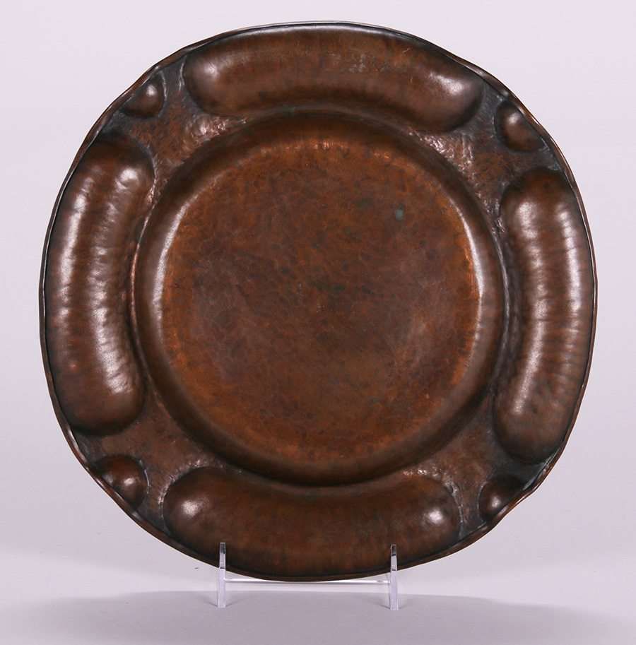 Early unsigned Dirk van Erp hammered copper wall plaque c1908-1909. Identical tray can be seen in this November 1909 photo of Dirk van Erp. Exhibited Dirk van Erp 2014. Excellent original patina. 12"d SOLD