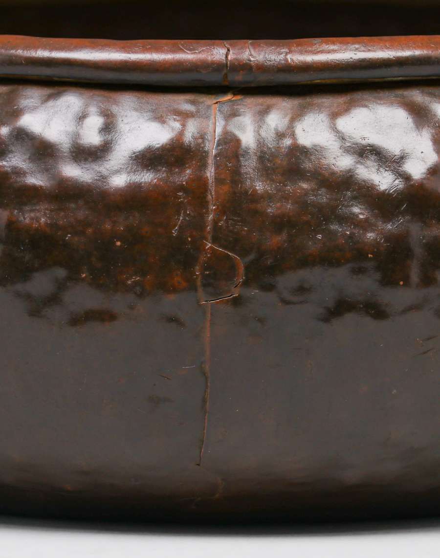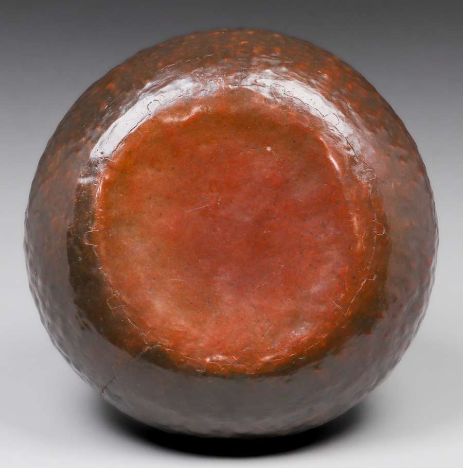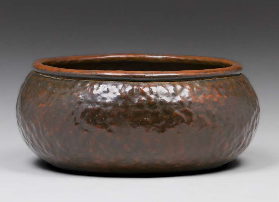 Early Unsigned Dirk van Erp “Warty” bowl c1909. Rare cramped-seam bottom. Excellent new patina. Exhibited Bay Area Copper 1900-1950, Dirk van Erp & His Influence 2012 page 14 fig 28. 10.5″d x 4.5″h SOLD
