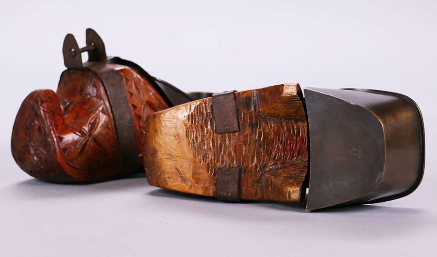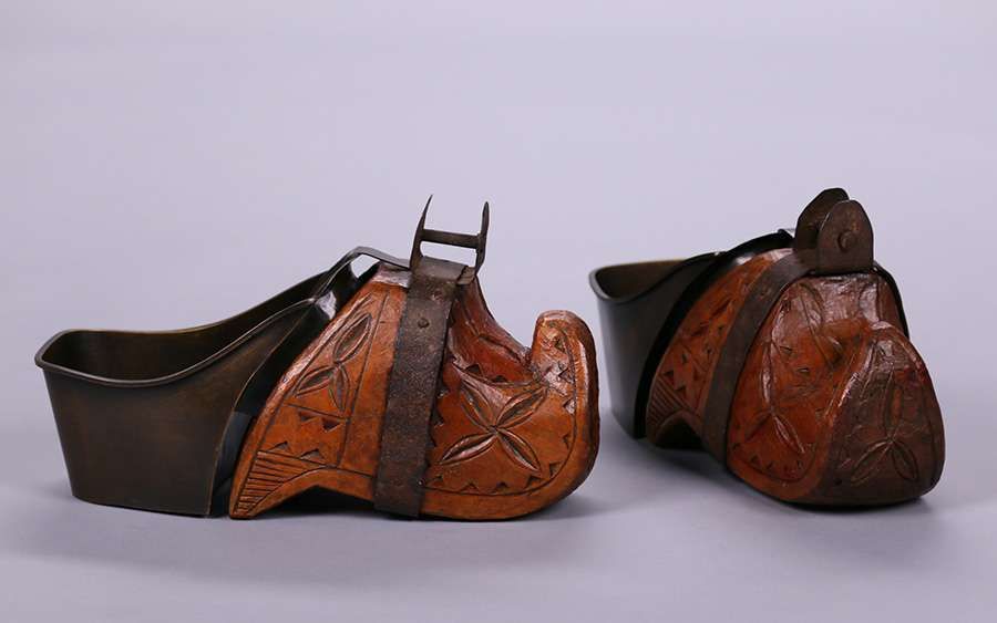 Extremely rare Dirk van Erp Dutch wooden clogs with hammered brass section and hand-forged iron stirrups. Signed with open-box, San Francisco, Handwrought mark. New patina. 7.5″h x 13″ x 5.25″w SOLD