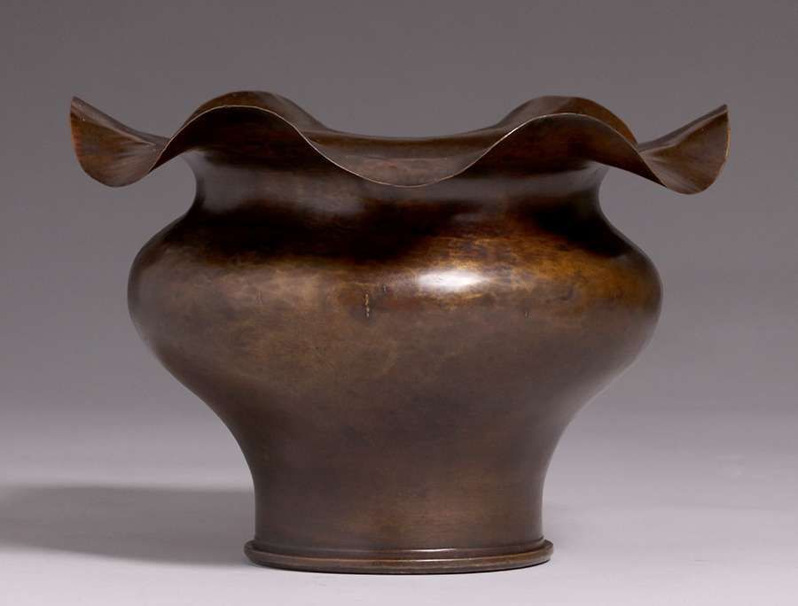 Large Dirk van Erp Hammered Brass Shell Casing Vase c1902-1906. Marked "Winchester Rep. Arms Co New Haven CONN 5-92". Excellent new patina. 7"h x 10"d SOLD