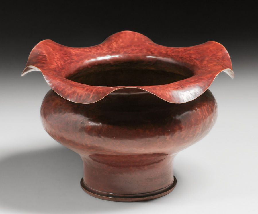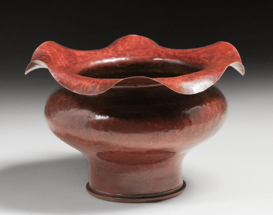 Large Dirk van Erp - Vallejo, CA Hammered Brass Shell Casing c1900-1908. Signed with Winchester Repeating Arms "W.R.A. 8-98" marking. Excellent new patina. 10"d x 6.5"h SOLD