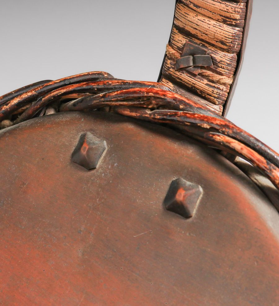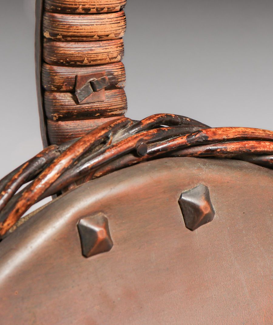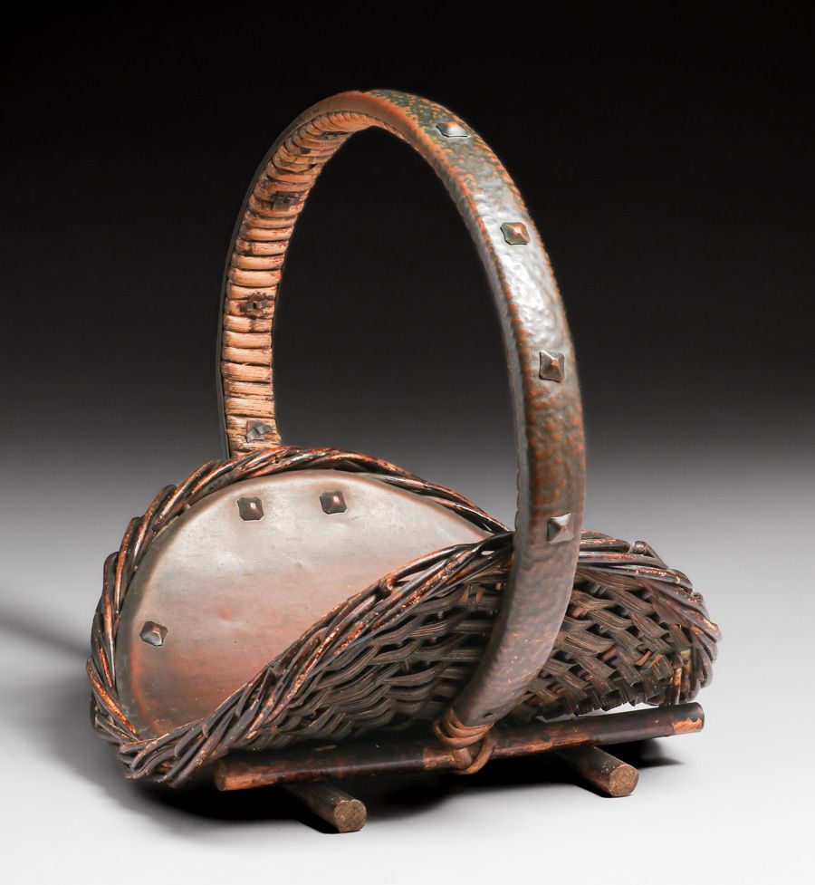 Small Dirk van Erp Willow Log Basket Hammered Copper Warty Handle & Copper Liner c1917-1920. Van Erp started offering these baskets during WWI as copper became scarce. This is the smallest version of this form we have seen. Unsigned. Excellent original patina. 14.5″h x 14.5″d x 12.75″w $5500