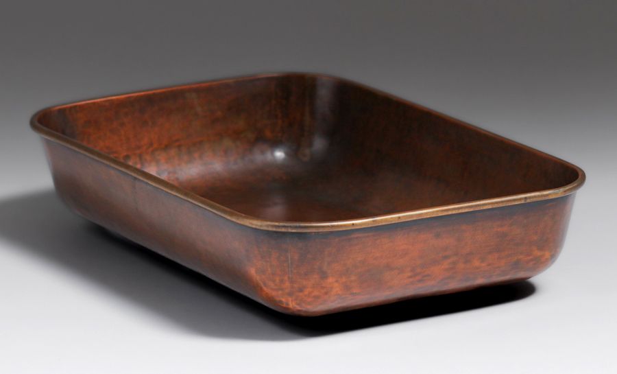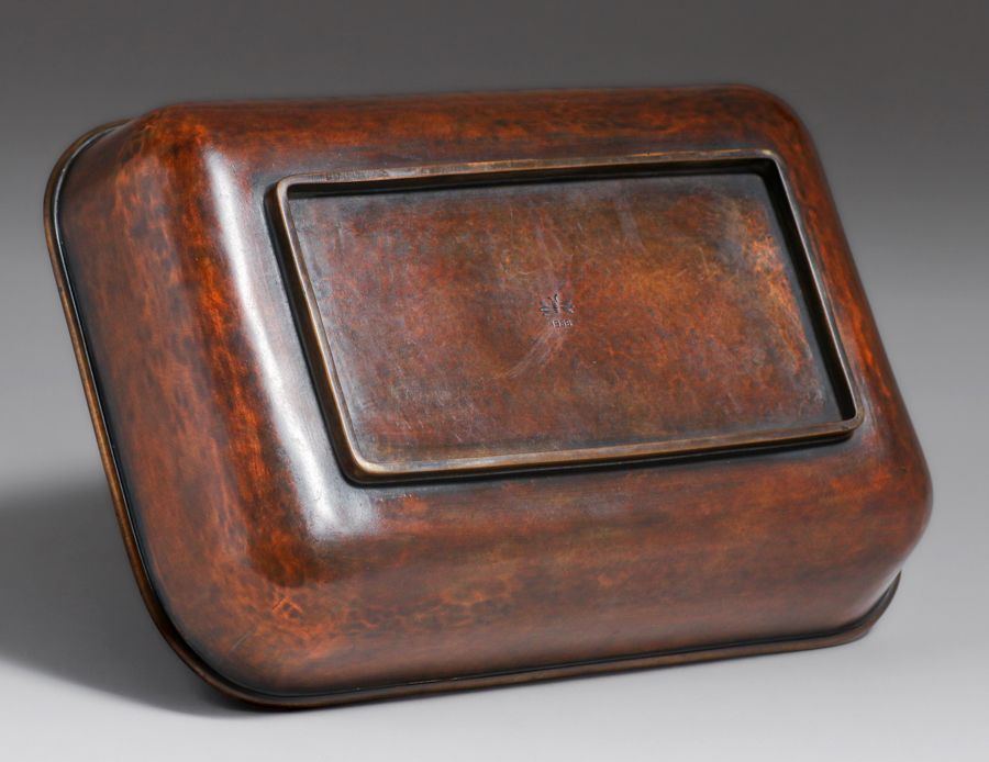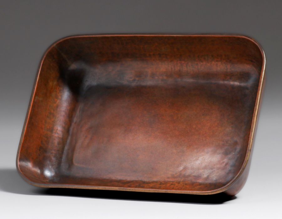 Dorothy Boyd Sailer Hammered Copper Serving Dish 1956. Sailer was a friend and student of Agatha van Erp (Hooy). Signed with impressed Bumble Bee mark. Excellent new patina. For more information see Bay Area Copper 1900-1950, Dirk van Erp & His Influence, page 45. 9.75" x 6.75" x 2.75"h SOLD