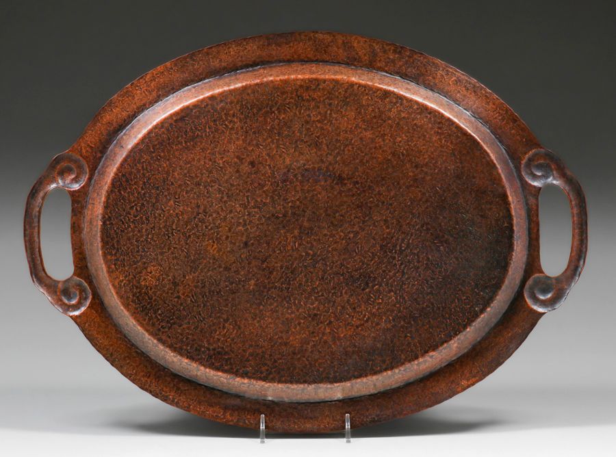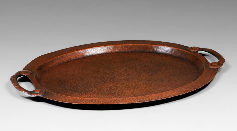Edward Ball Hammered Copper Tray c1918-1919. Excellent new patina. Impressed "EB" mark. Excellent example of this obscure New York metalsmith. 17 3/8"w x 12 3/8" SOLD