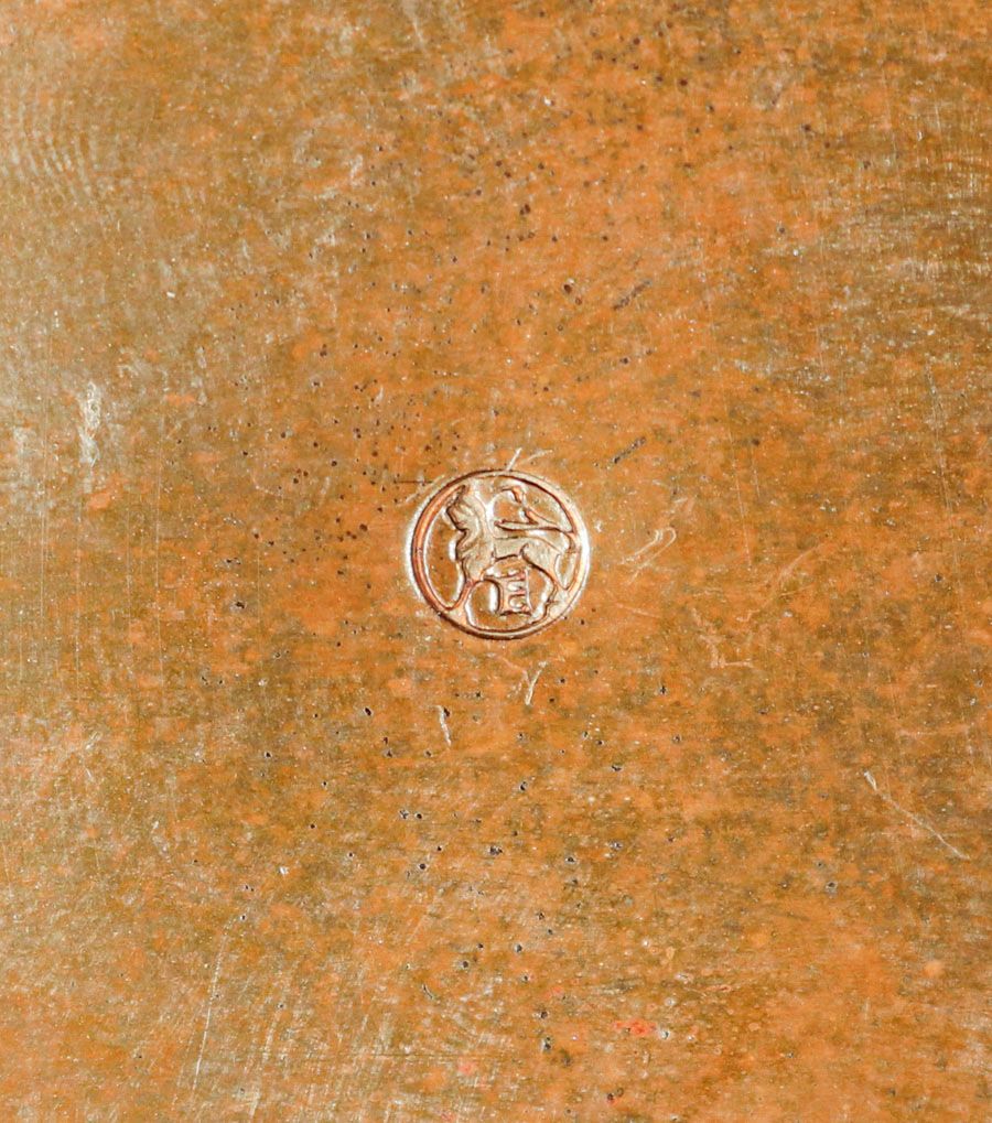 Erhard & Sohne – German Arts & Crafts Mahogany & Brass Jewelry Box c1905. Comes with original key. Signed. Aged patina. Erhard Sohne was granted the world patent for the manufacture of brass inlay in 1904. 5 1/8"w x 3.5"d x 2.25"h SOLD