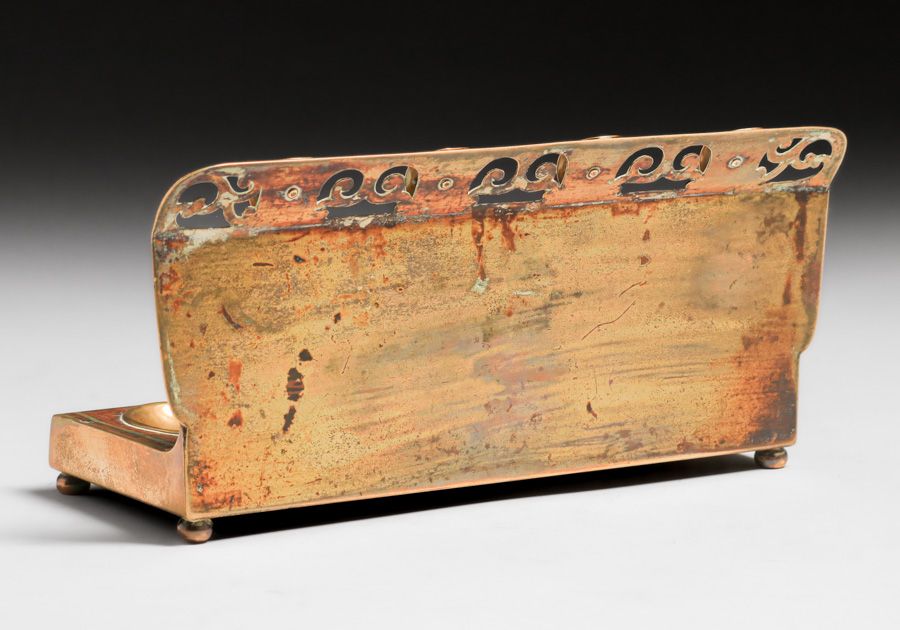 Erhard & Sohne – German Arts & Crafts Mahogany & Brass Pipe Rest c1905. Unsigned. Excellent original patina. Erhard Sohne was granted the world patent for the manufacture of brass inlay in 1904. 8 5/8"w x 4"h x 3.25"d SOLD