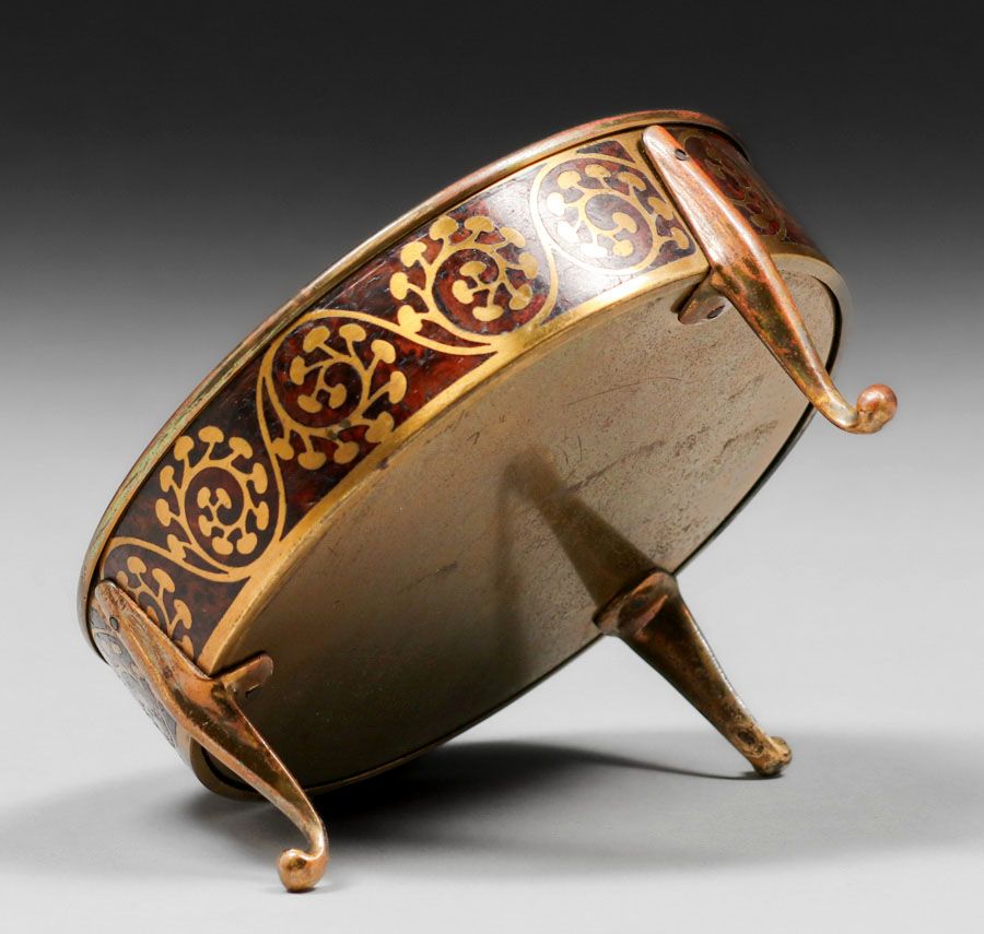Erhard & Sohne – German Arts & Crafts Mahogany & Brass Round Covered Box c1905. Unsigned. Excellent original patina. Erhard Sohne was granted the world patent for the manufacture of brass inlay in 1904. 4.25″d x 2.75″h SOLD