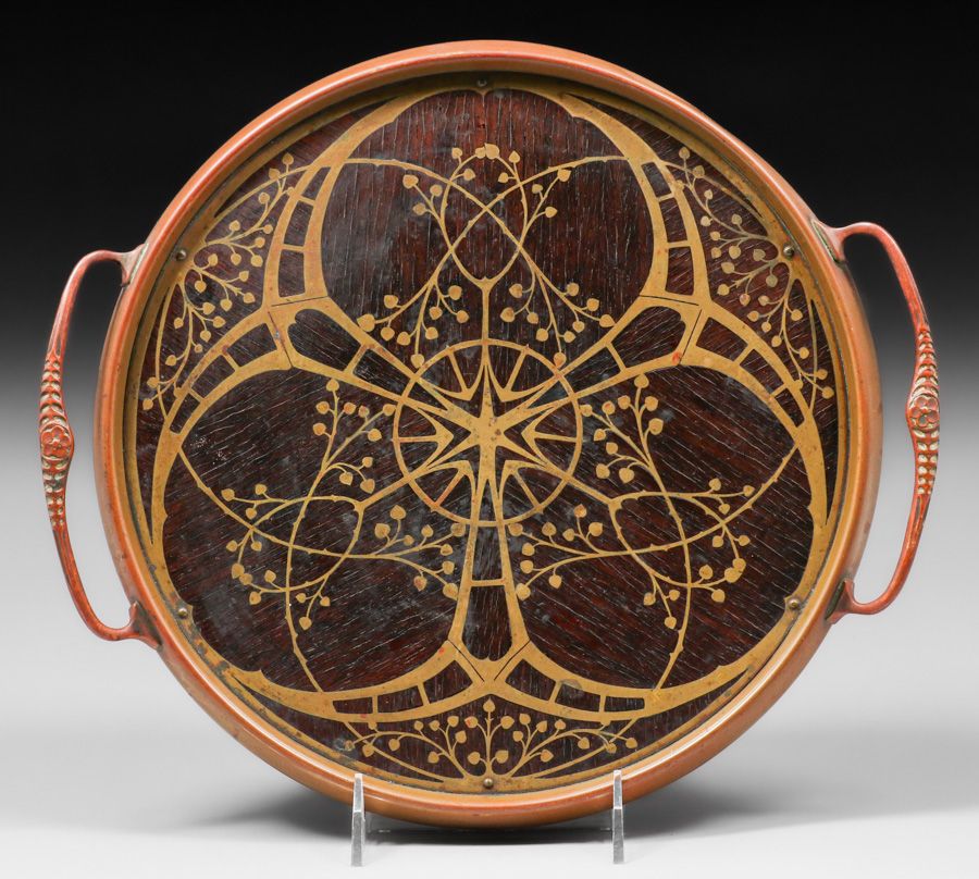 Erhard & Sohne – German Arts & Crafts Mahogany & Brass Two-Handled Tray c1905. Unsigned. Excellent original patina. Erhard Sohne was granted the world patent for the manufacture of brass inlay in 1904. 13"w x 11"d SOLD