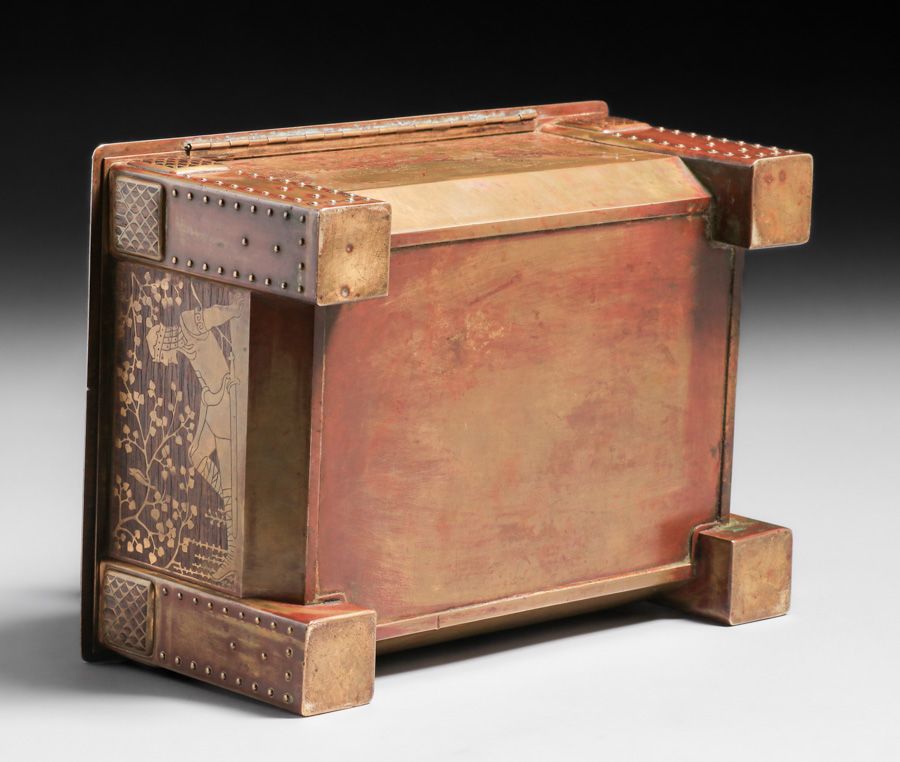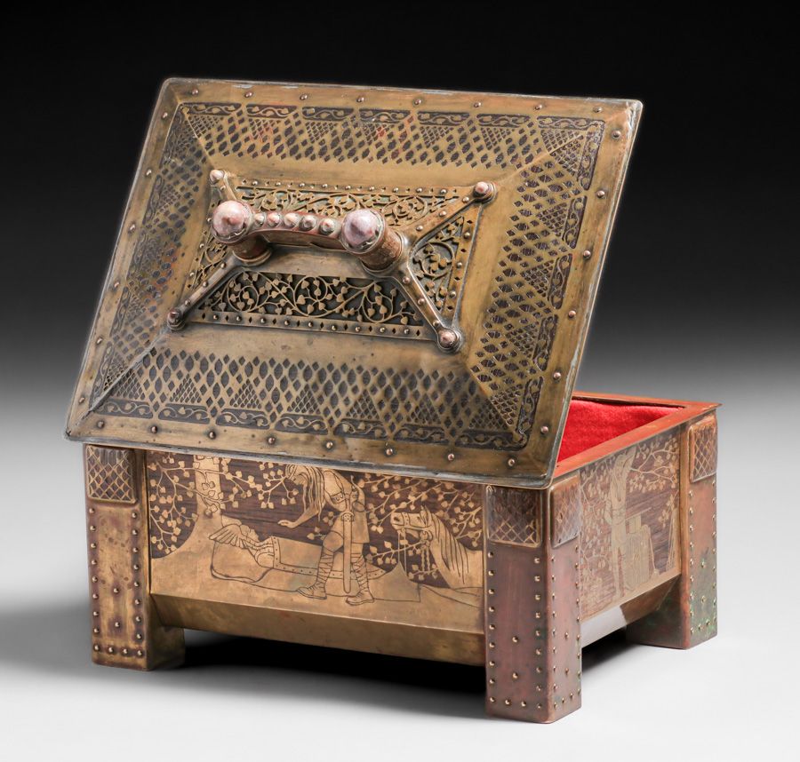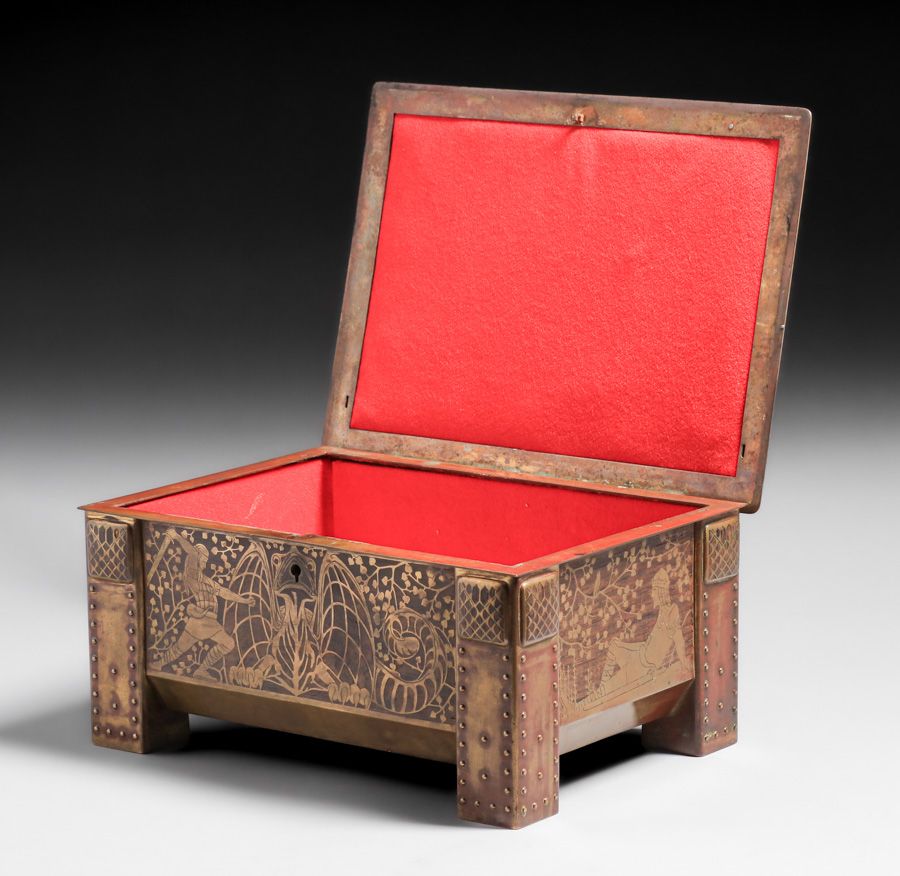 Important Erhard & Sohne – German Arts & Crafts Mahogany & Brass Jewelry Casket c1905. Agate cabochons and German folklore motifs. Unsigned. Excellent original patina. Erhard & Sohne was granted the world patent for the manufacture of brass inlay in 1904. 12.25"w x 9" x 8.25"h