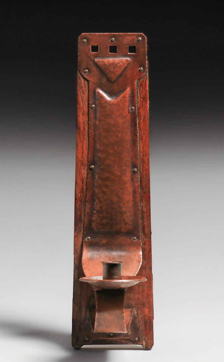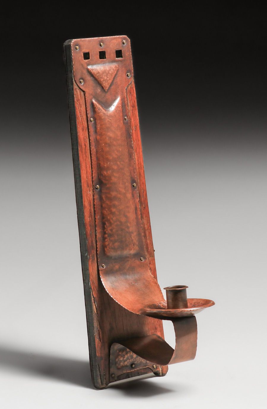 - Forest Craft Guild Hammered Copper & Oak Cutout Candle Sconce c1910