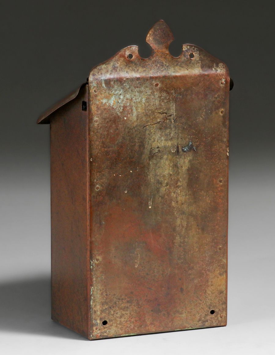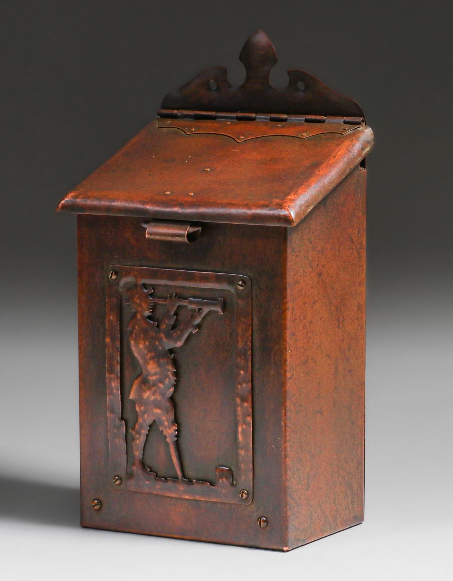 Grand Rapids Hammered Copper Cutout Mailbox c1910. Similar to Forest Craft Guild. Unsigned. Excellent new patina. 12.5"h x 6.75"w x 4.5"d $1200