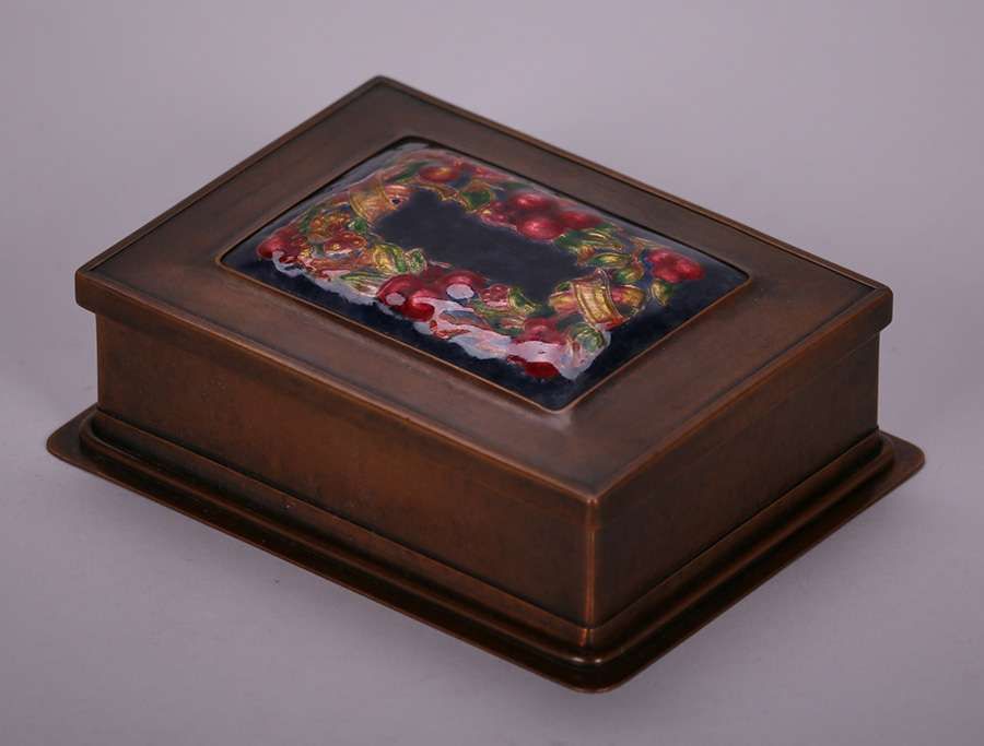 Frank Marshall (attributed) hammered copper and enamel rectangular box. Boston, MA. Unsigned. Excellent new patina. 6 5/8"w x 5 1/8" x 2.25"h SOLD