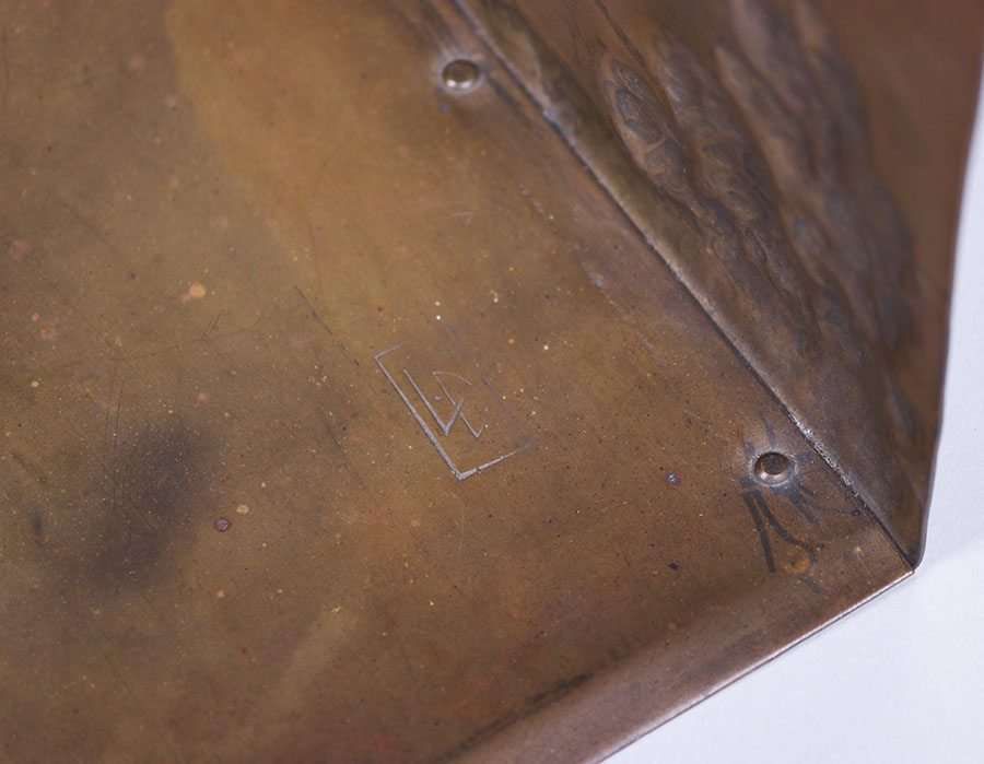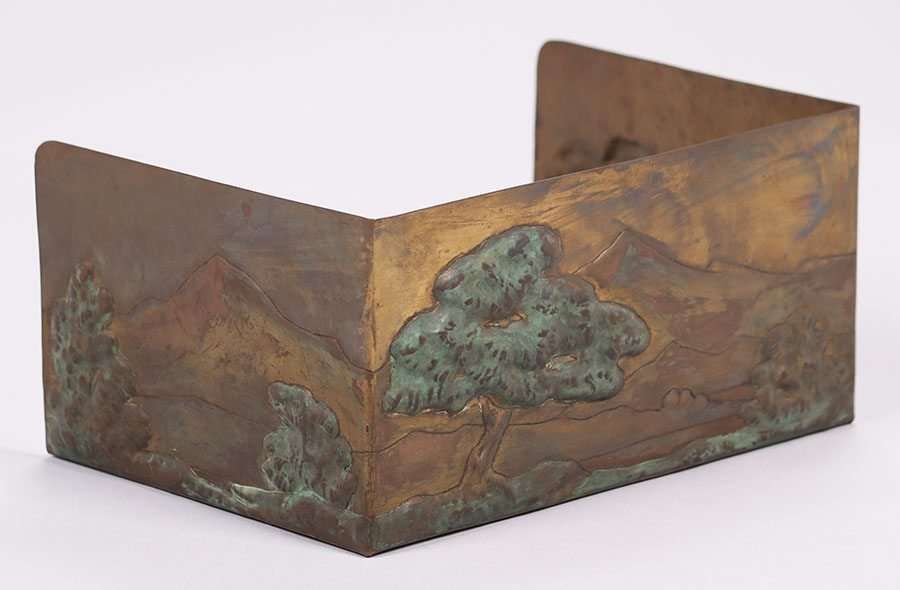 Frederick Lueders (1875-1970) hammered brass bookrack with incredibly beautiful repousse Monterey Cypress trees. Lueders was trained by and worked for Elizabeth Burton of Santa Barbara from 1902-1909. He lived and worked as a designer and metalsmith in Pasadena from 1910-1912. Lueders made the lamp in the entrance to The Gamble House in Pasadena. His works are extremely rare. Signed LD for Lueders Design. Excellent original patina. 5"h x 10.25"w x 7"d SOLD
