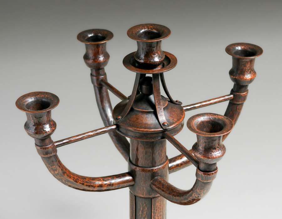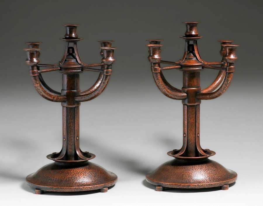 - Pair George H. Trautmann – attributed Chicago Hammered Copper Candelabras c1910