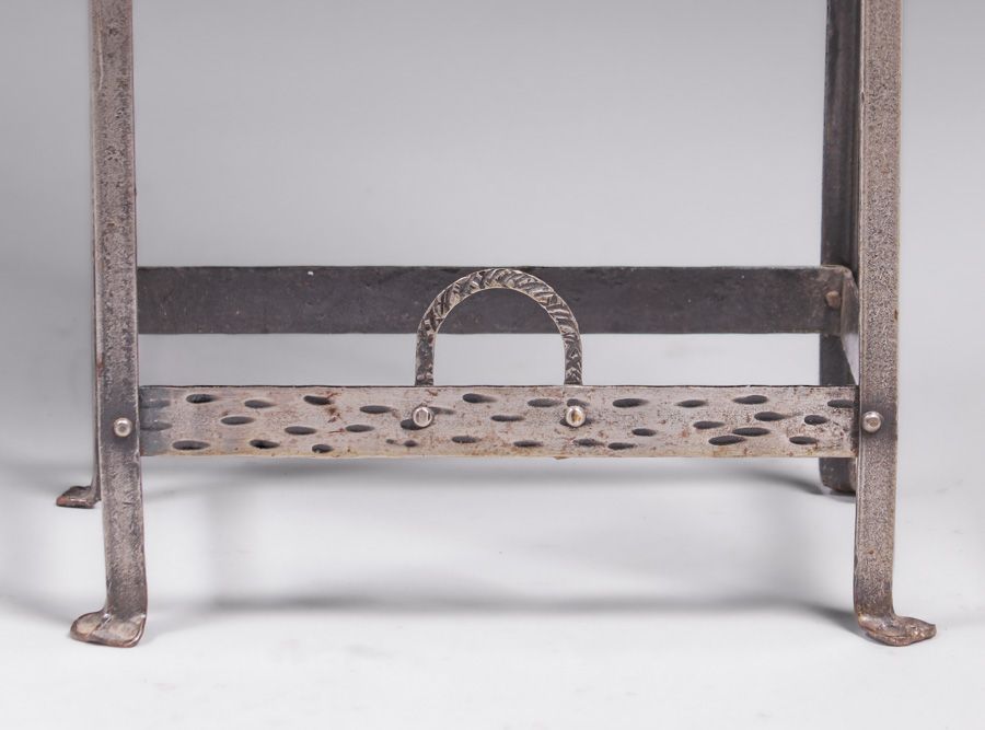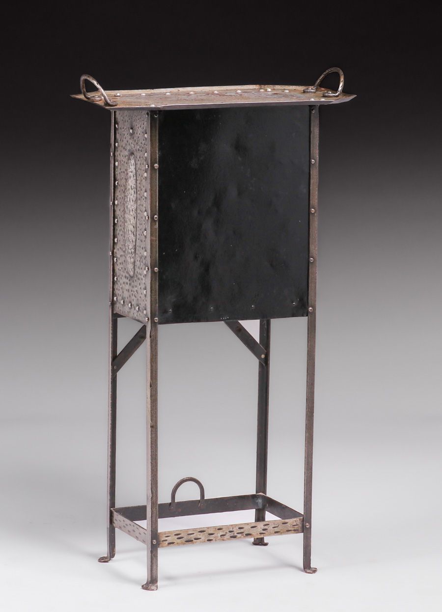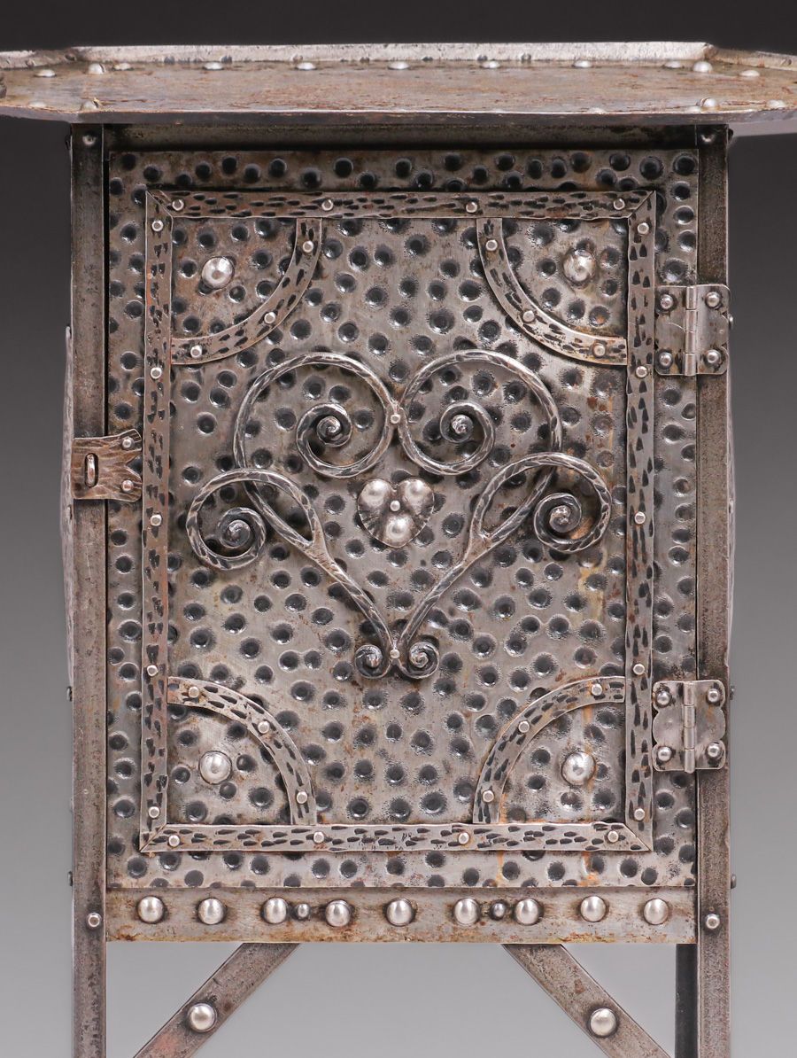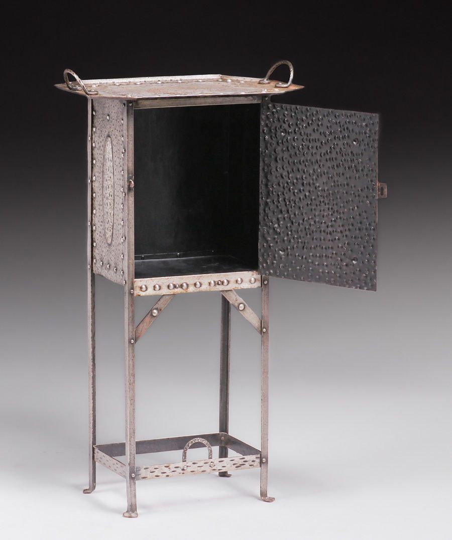 Hugo Berger - Goberg - German Silver-Plated Hand-Forged Iron Liquor Cabinet c1900s. Holds 6 bottles of wine standing. Unsigned. Excellent original patina. 18"w x 11.25"d x 33 7/8"h (32.25"h to top surface) $3800