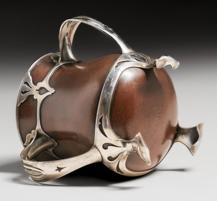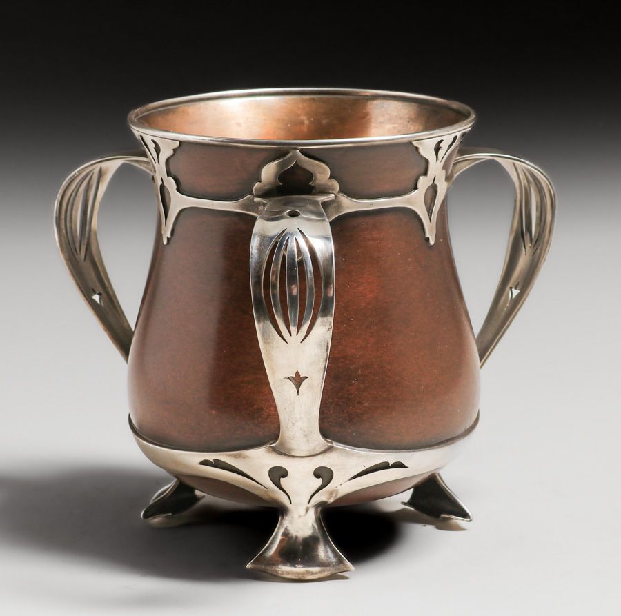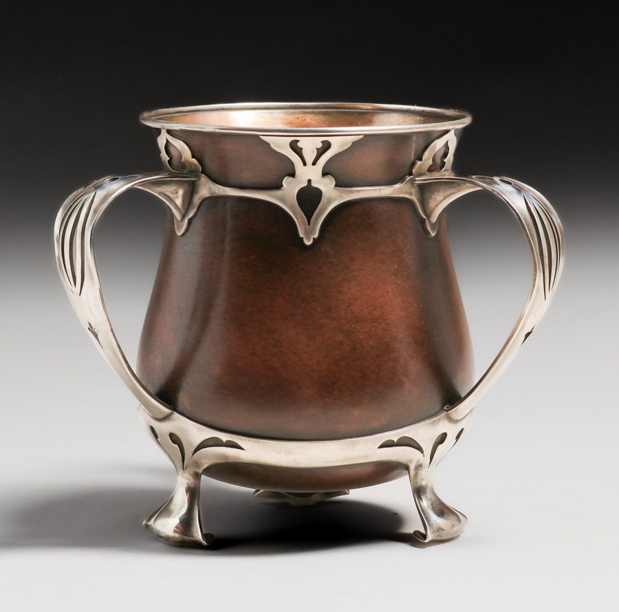 - Gorham "Athenic" Copper & Silver Cutout Three-Handled Vase c1900