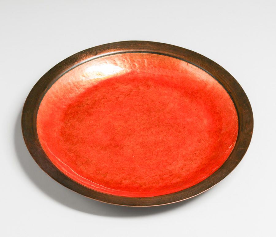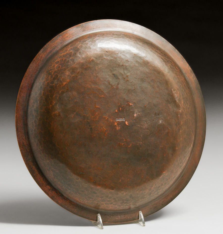 21772. Guildcraft Hammered Copper & Enamel Tray c1930s. Signed. Excellent original patina. 12″d $375