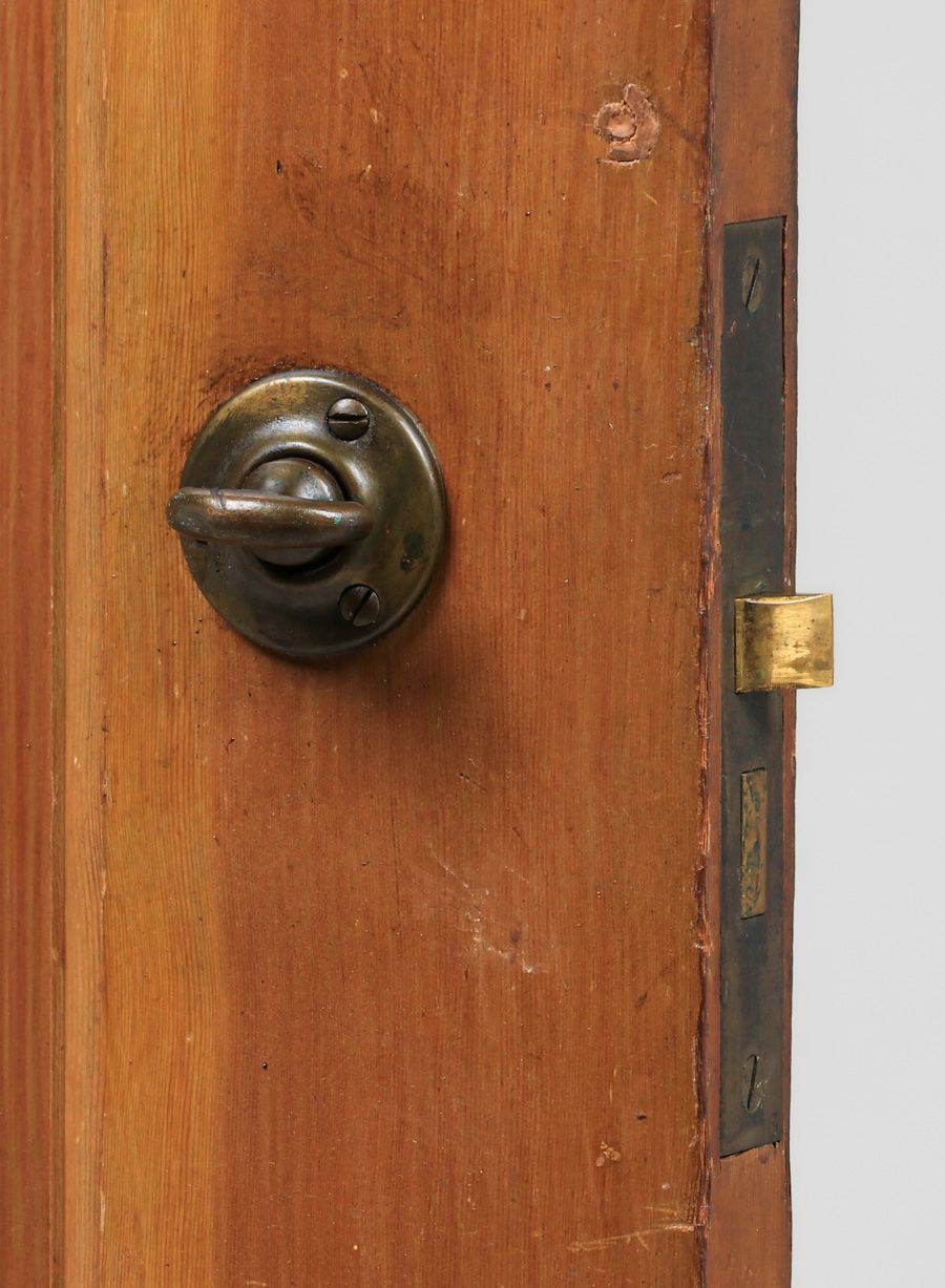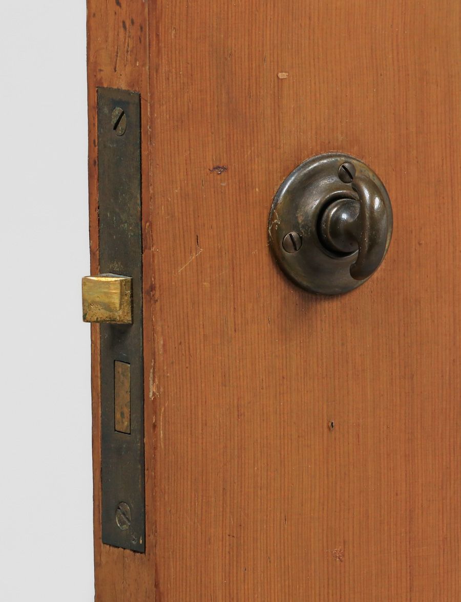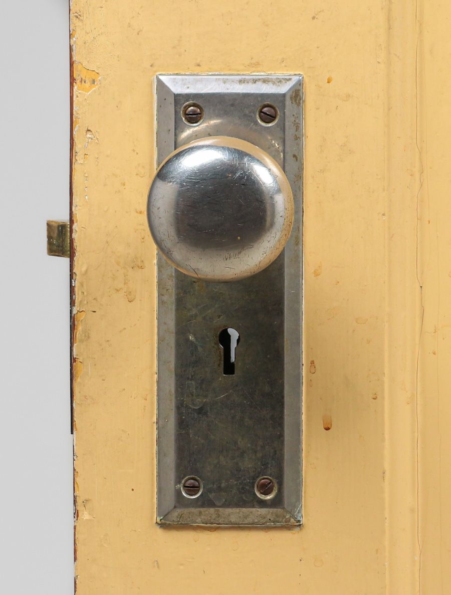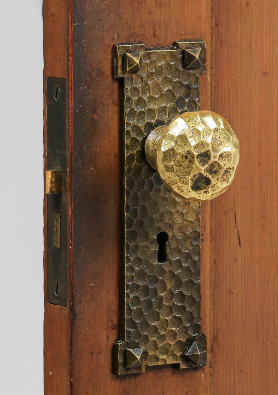Harry St John Dixon Hammered Brass Door Knobs c1923. Set of 3 Dixon doorknobs. The back plates are stock cast backplates. Dixon hammered the three door knobs for the Phillips Frisbie Lewis Residence on Broadway Terrace in Oakland. Lewis was a student of Xavier Martinez at the California College of Arts & Crafts and Armin Hansen in Monterey. Provenance: Phillips Frisbie Lewis Residence, Oakland. Backplate 8"h x 2 5/8"w SOLD