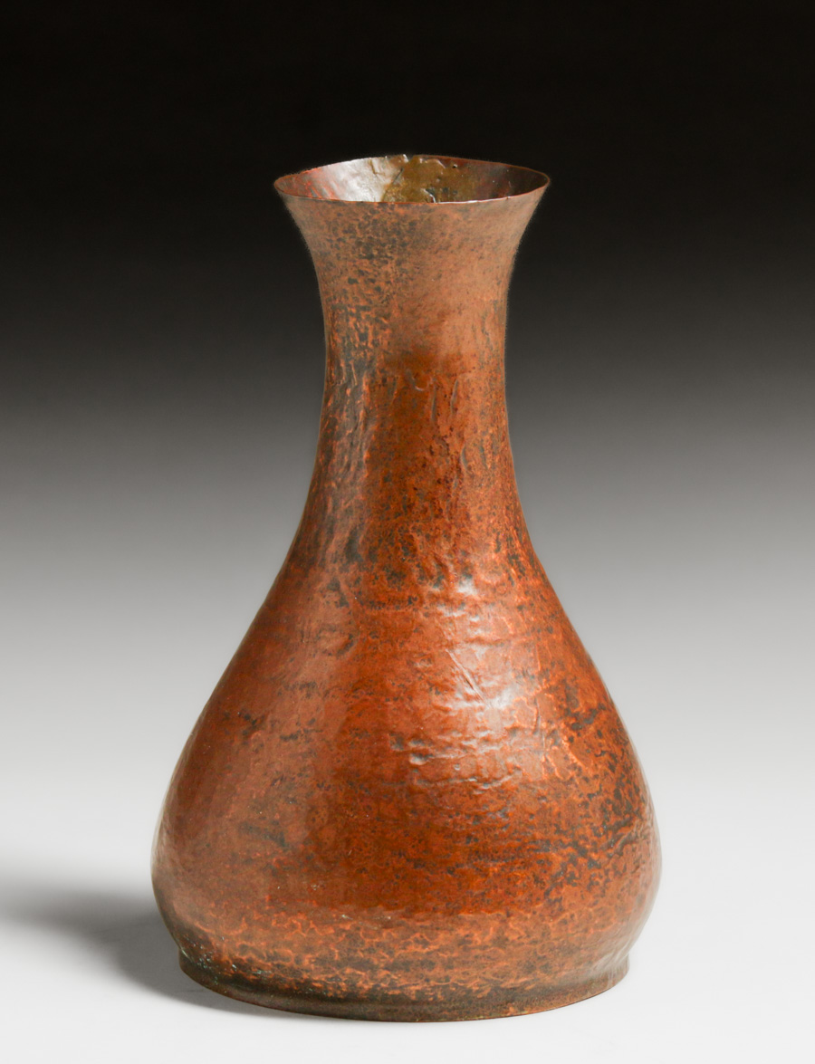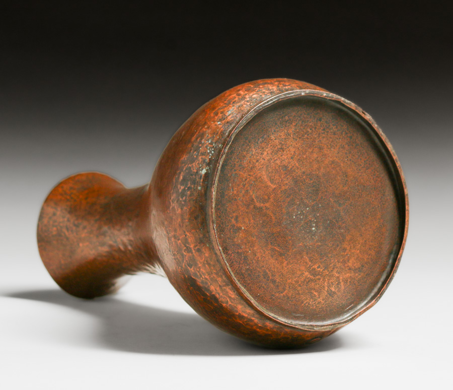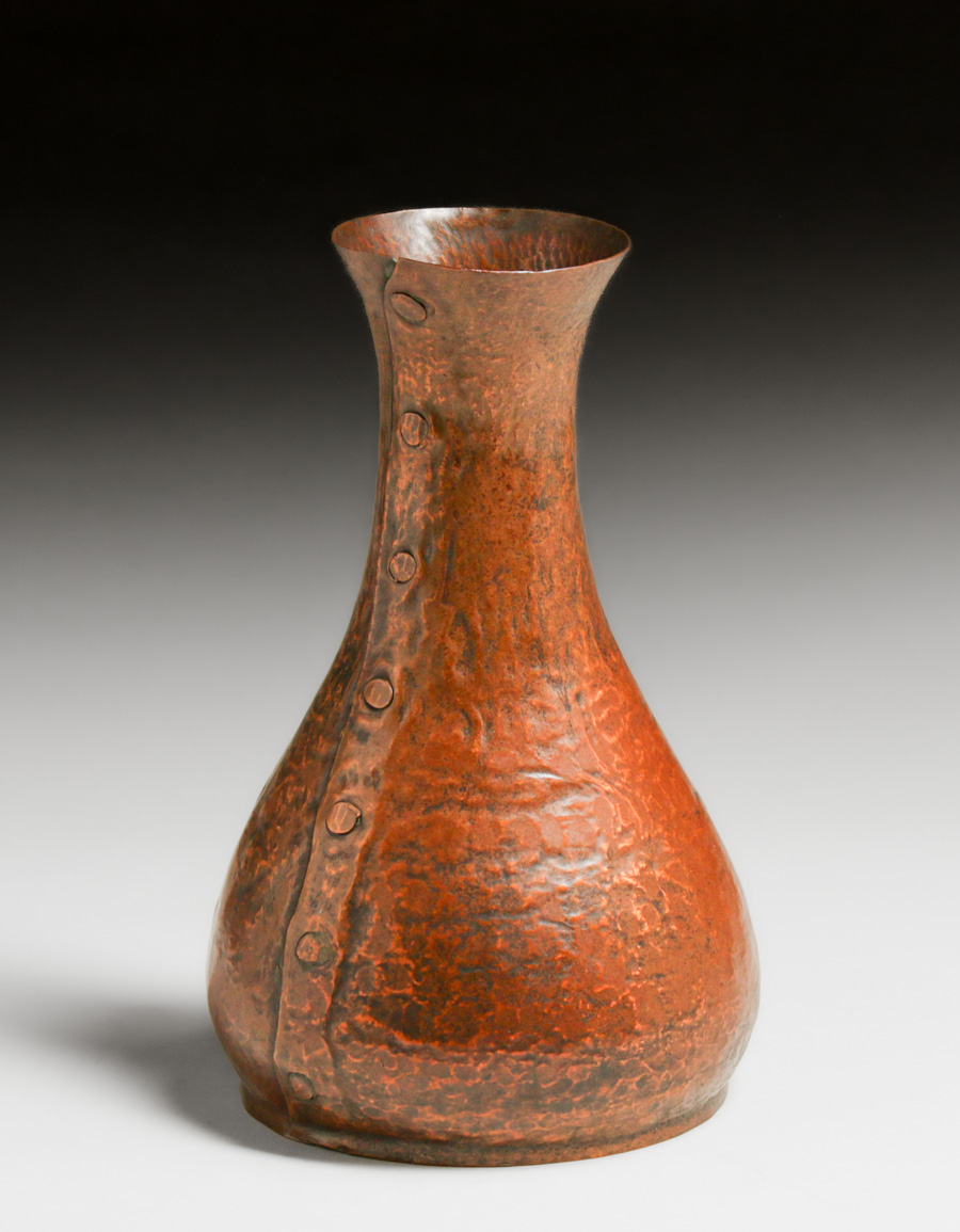 21724. Harry St John Dixon Hammered Copper Riveted Vase c1920.  Unsigned. Color added to original patina.  This is a variation on a form that Harry Dixon made when demonstrating at Craft Shows.  7″h x 4.5″d $950