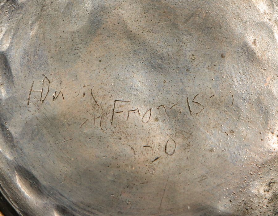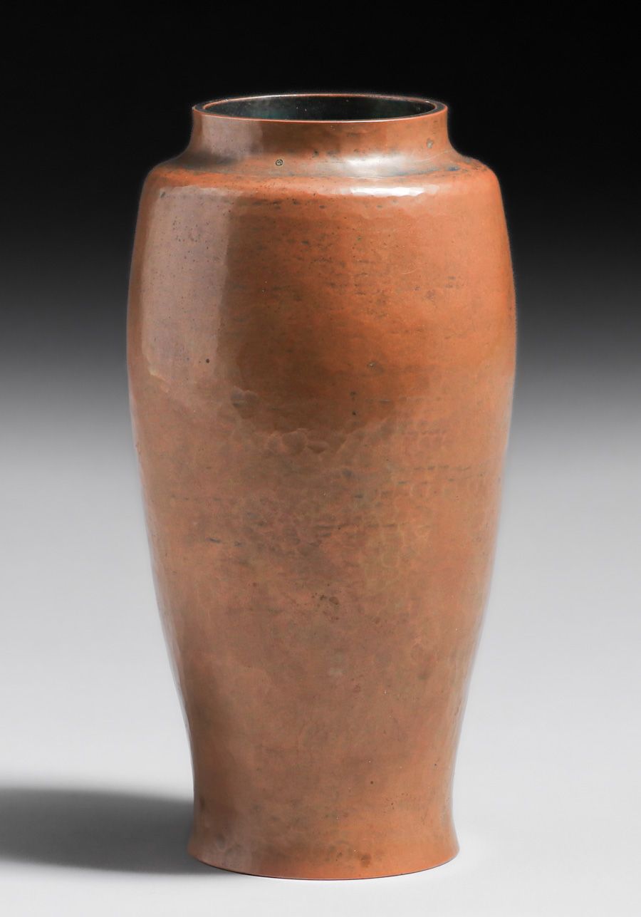 Harry St John Dixon Hammered Copper Vase 1920. Signed with the earliest example of Dixon's inscribed signature. Having been trained by Dirk van Erp and after working with Lillian Palmer for several years, Dixon opened his own shop in San Francisco in 1920. This is a great, early example of his work. Excellent original patina. 7"h x 3.25"d SOLD