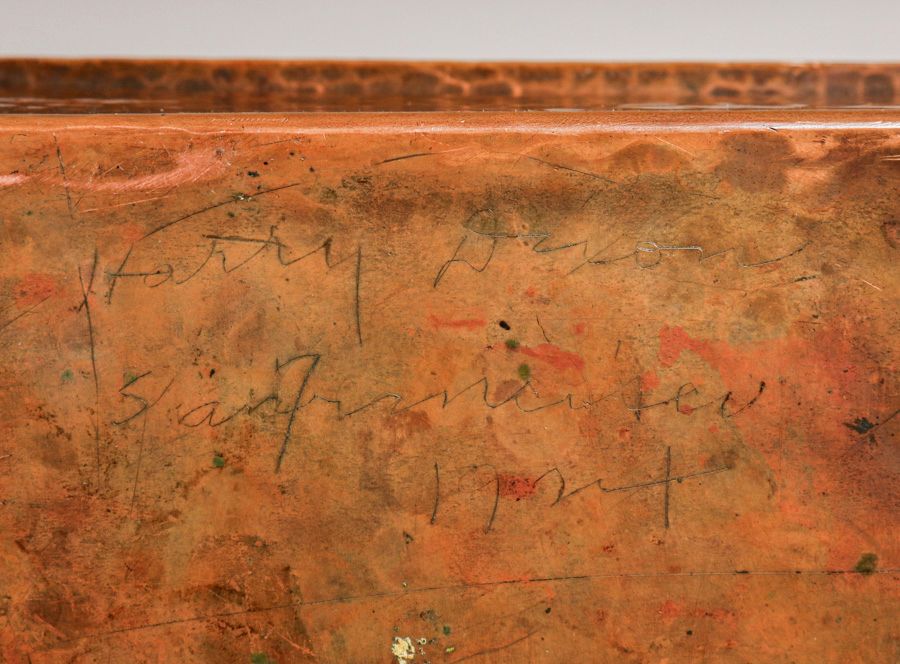 Massive Harry St John Dixon Hammered Copper Puzzle Box 1924. Inscribed "Harry Dixon San Francisco 1924". Excellent original patina. The is the largest Harry Dixon puzzle box we have ever seen. 9.75"w x 7.75"d x 4.25"h SOLD