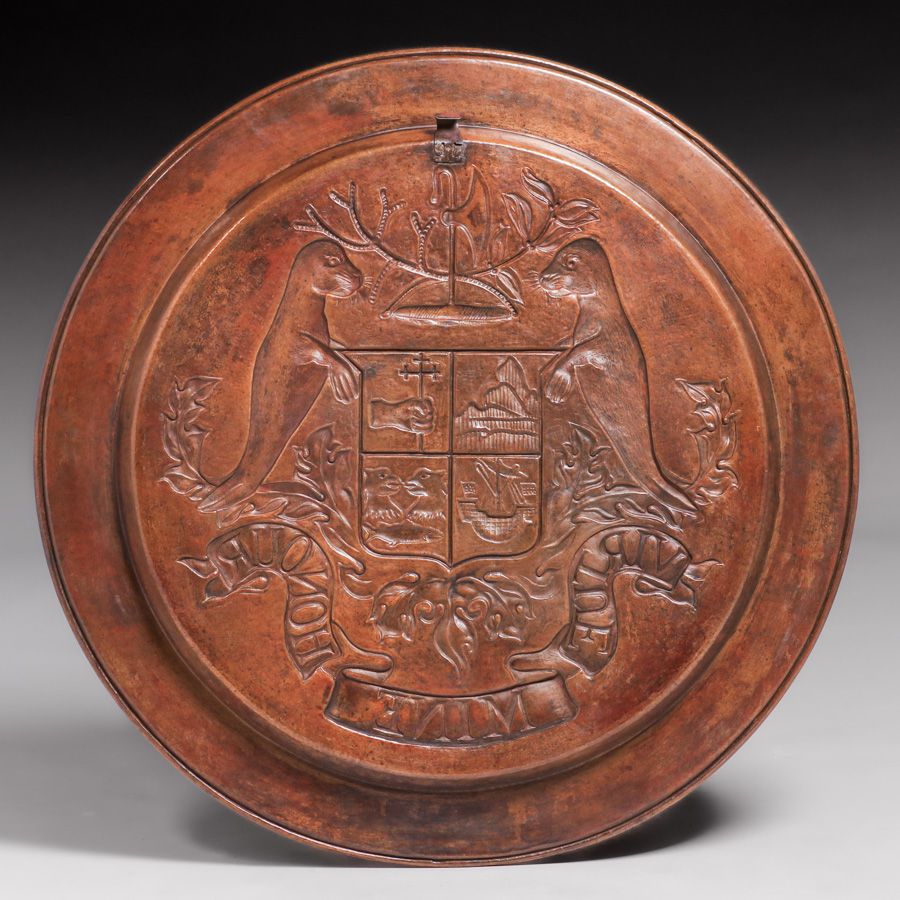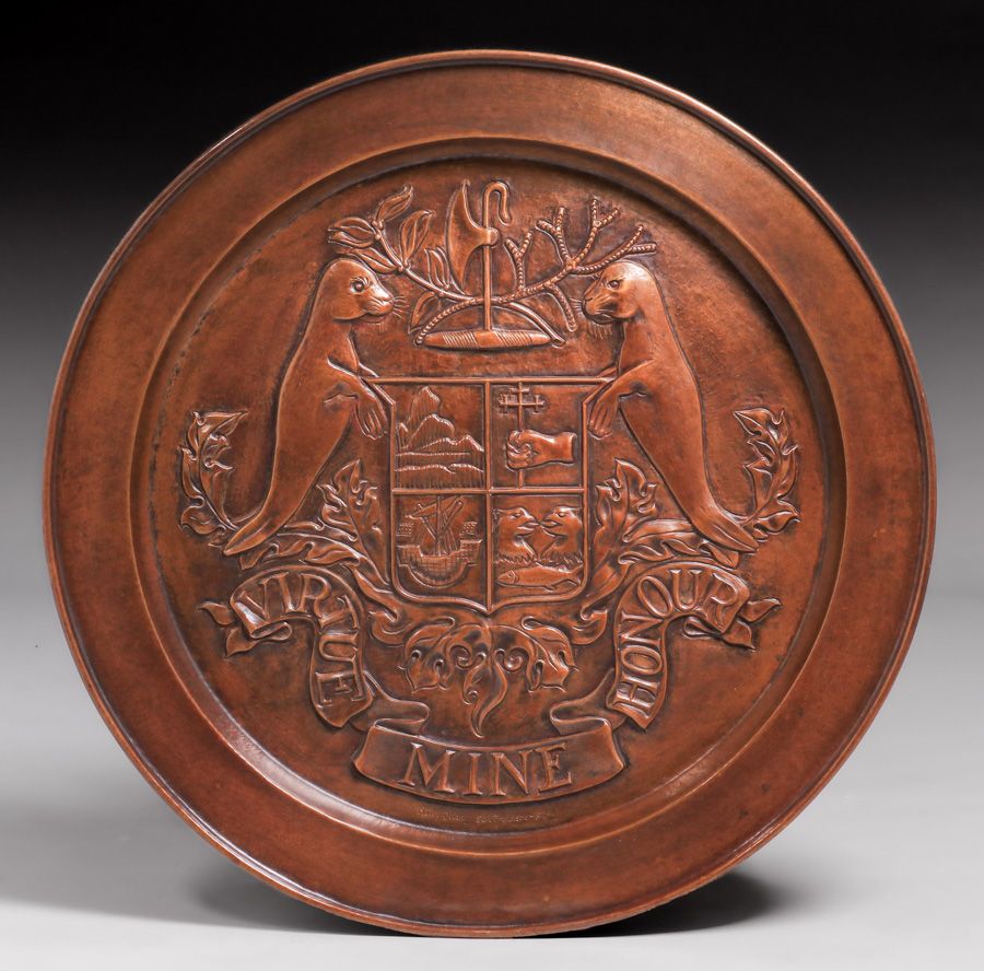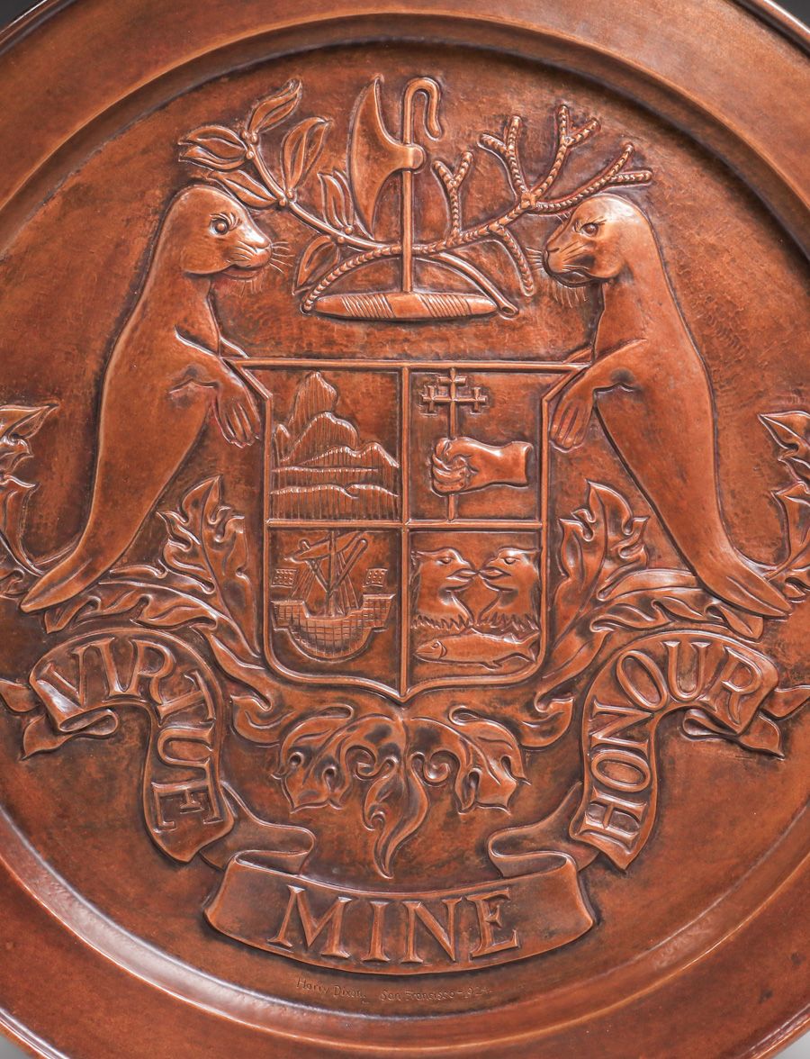 Massive Harry St John Dixon Hand-Hammered Brass Scottish Plaque 1924. Excellent new patina. "Virtue Mine Honour" 31.5"d SOLD