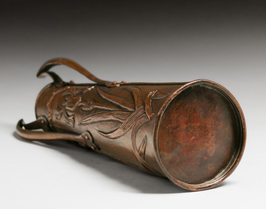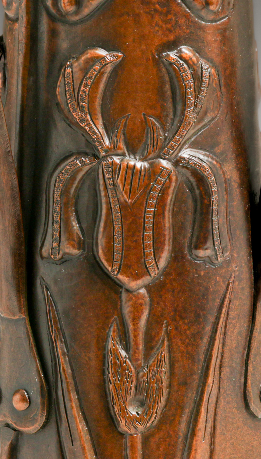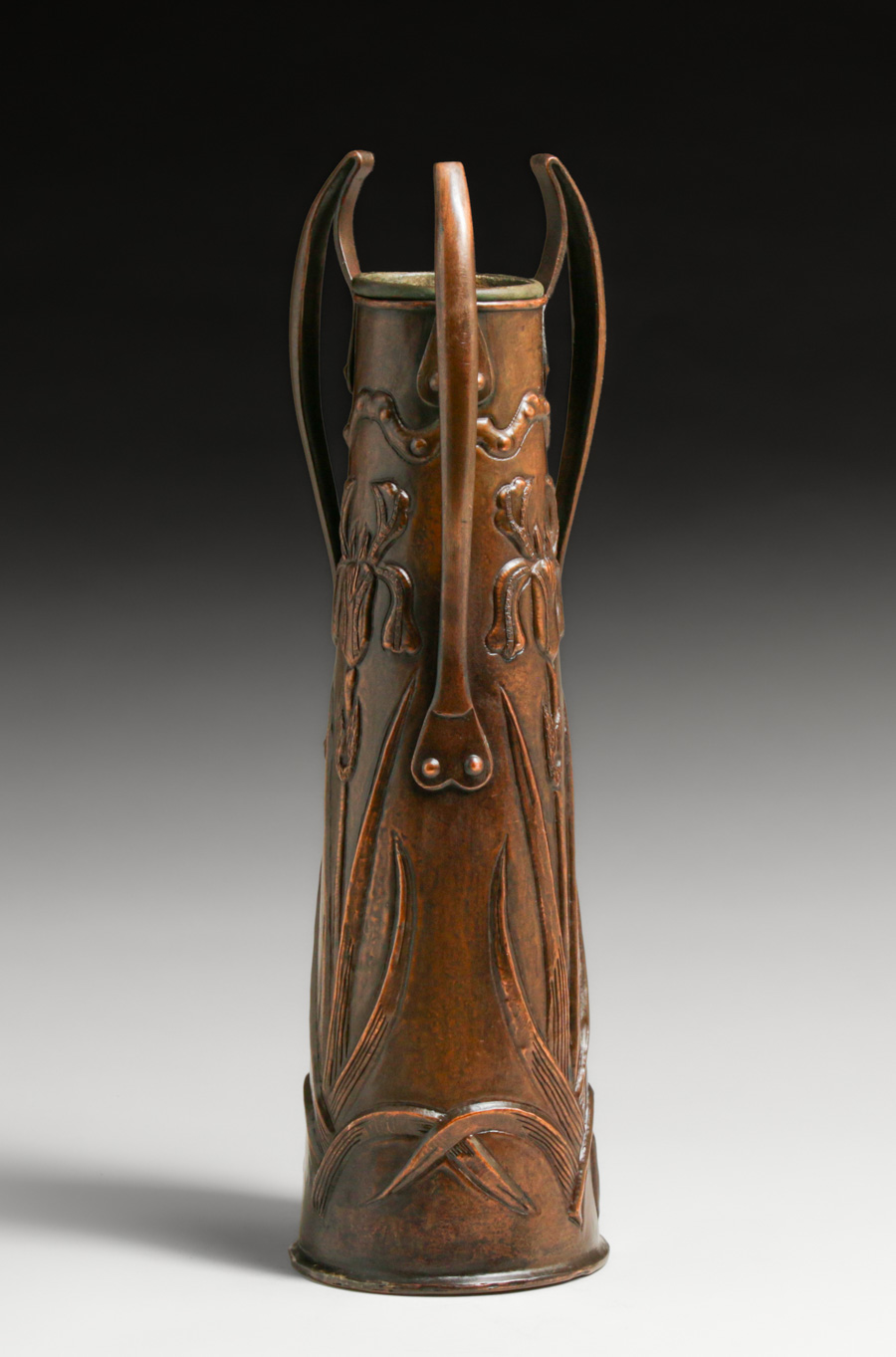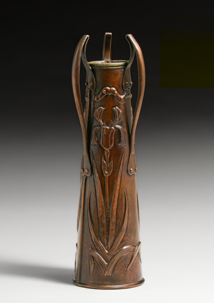 21718. Ickleford Art Industries – Hertfordshire, England Hammered Copper & Brass Three-Handled Vase c1905.  Unsigned. Excellent new patina.  14.25″h x 4.25″d $950
