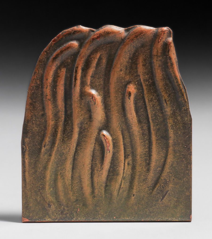 Jauchens Olde Copper Shop – San Francisco Hammered Copper Eucalyptus Form Bookends c1915. Rare example of Jauchen’s Eucalyptus work in repousse. Signed. Excellent original patina. 5.75"h x 5"w SOLD