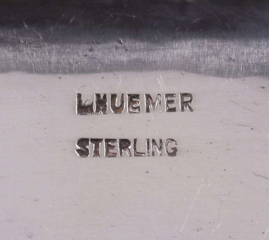 L. Huemer hand-hammered sterling silver two-handled tray c1920s. Huemer worked for Hirsch Co. and Tiffany Studios. Signed. Excellent condition. 17"w x 9.25" SOLD